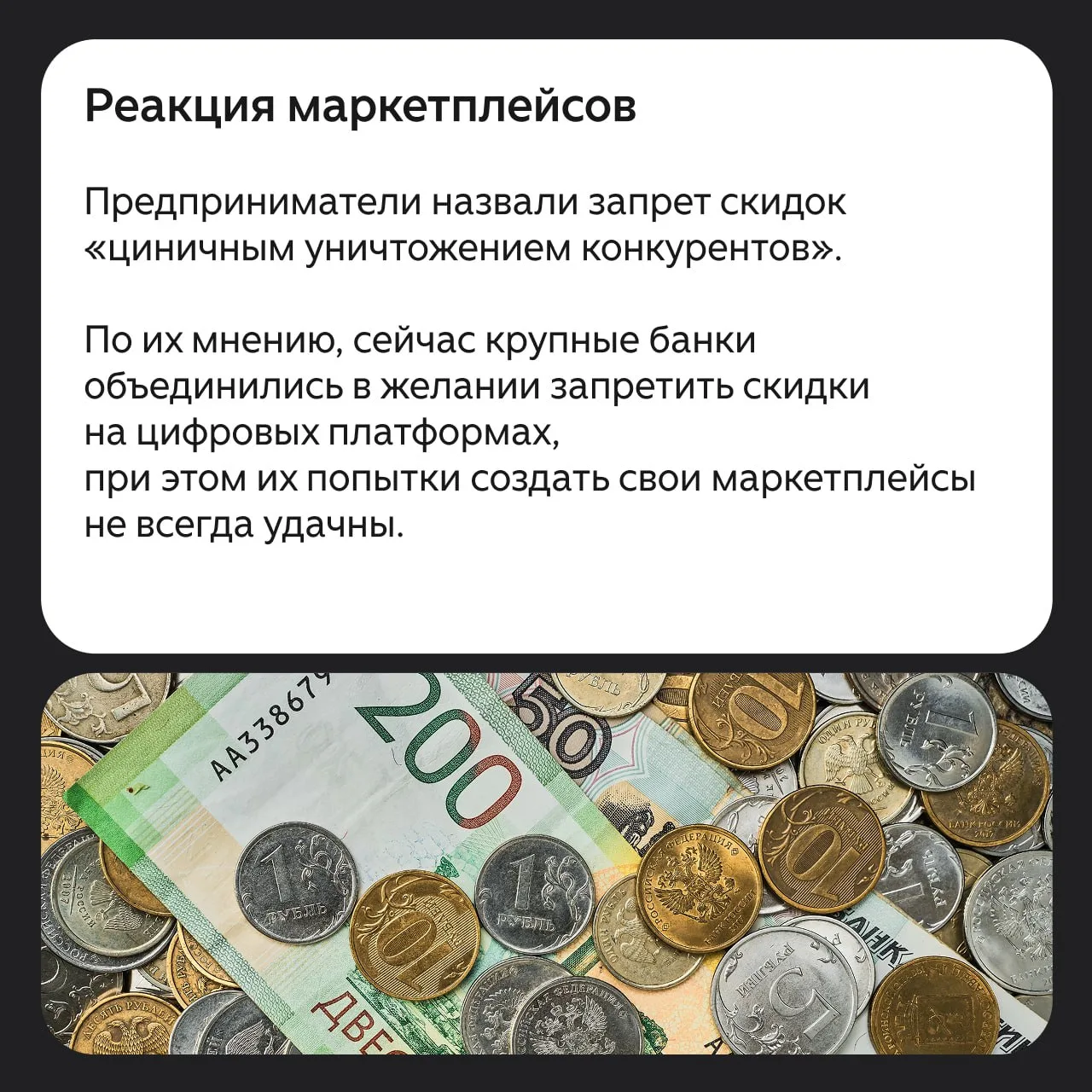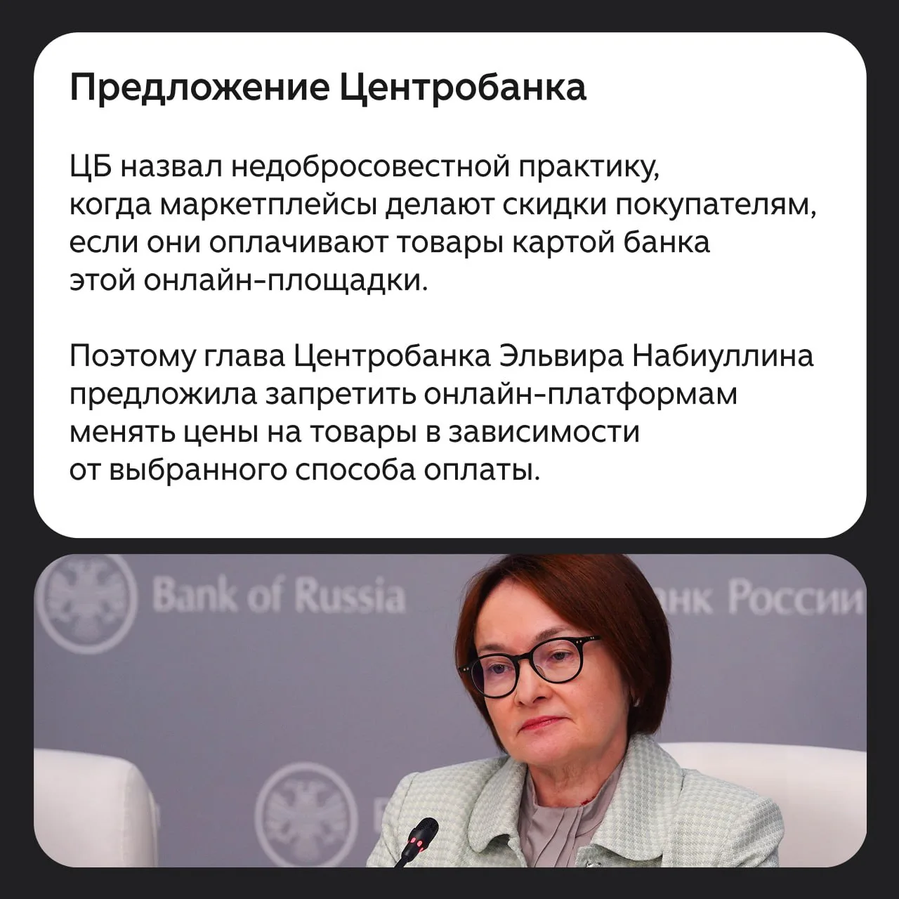 ➡️ ЦБ посчитал, что в России недопустимо устанавливать разные цены на маркетплейсах в зависимости от способа оплаты.