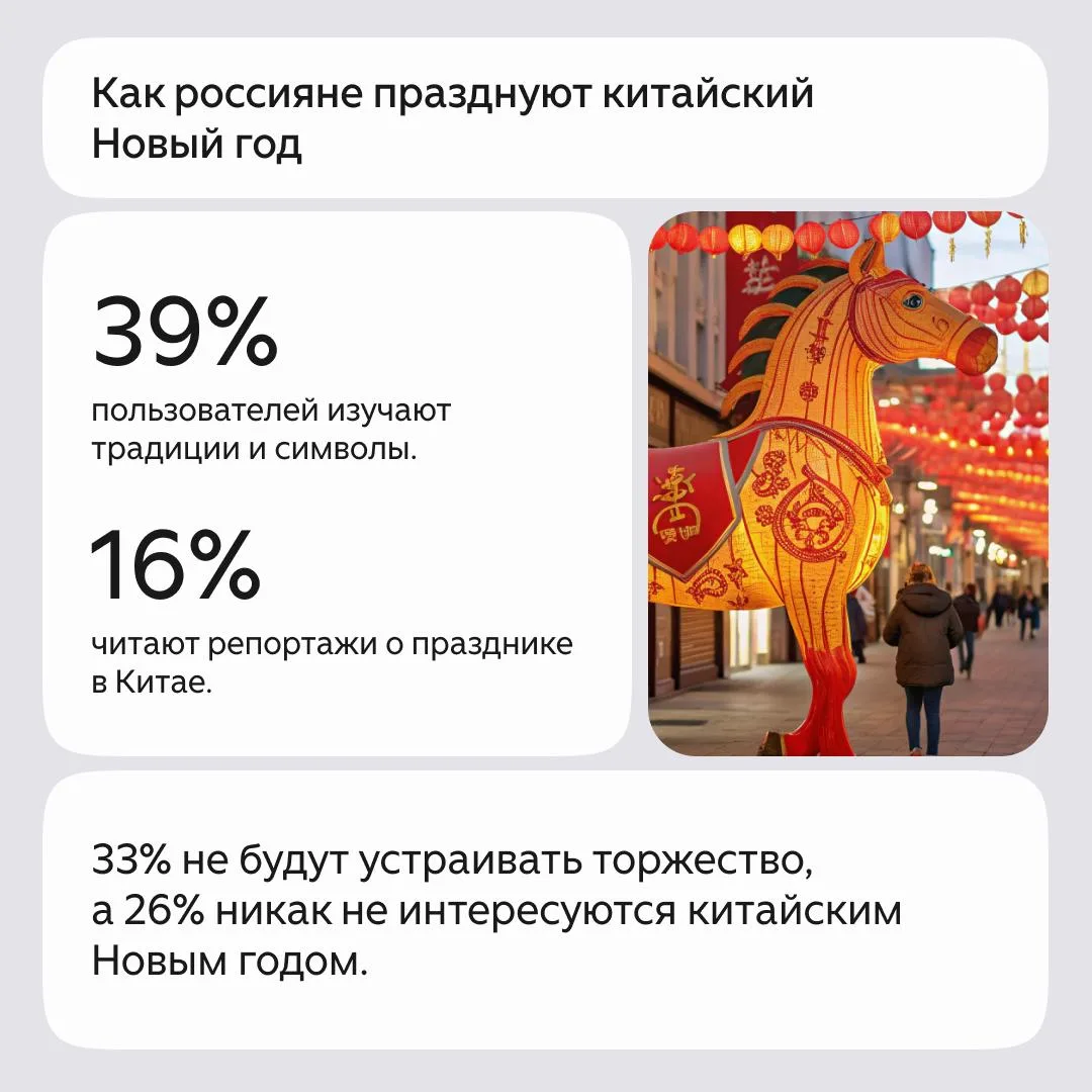 С начала 2026-го китайским Новым годом интересовалось на 35% больше россиян, а число публикаций в Дзене на эту тему выросло на 40%. Как россияне проведут китайский Новый год и какими праздничными традициями интересуются — узнайте из слайдов.