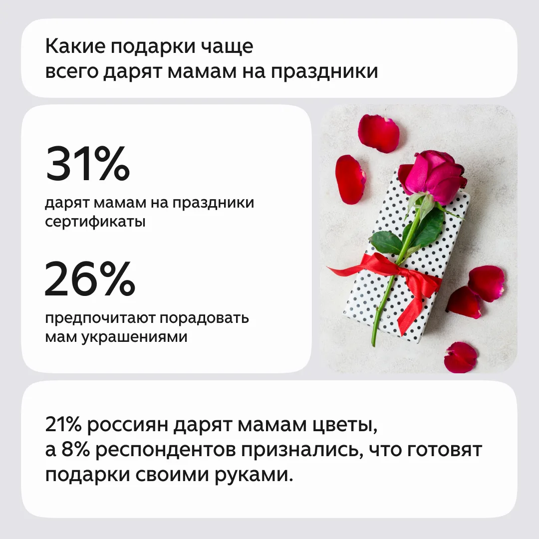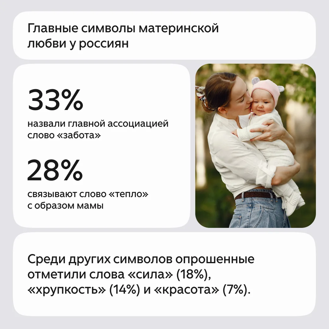 По опросам, с образом мамы у россиян ассоциируются слова «забота», «тепло», «сила», «хрупкость» и «красота». При этом на День матери многие россияне чаще всего дарят мамам сертификаты, украшения и цветы.