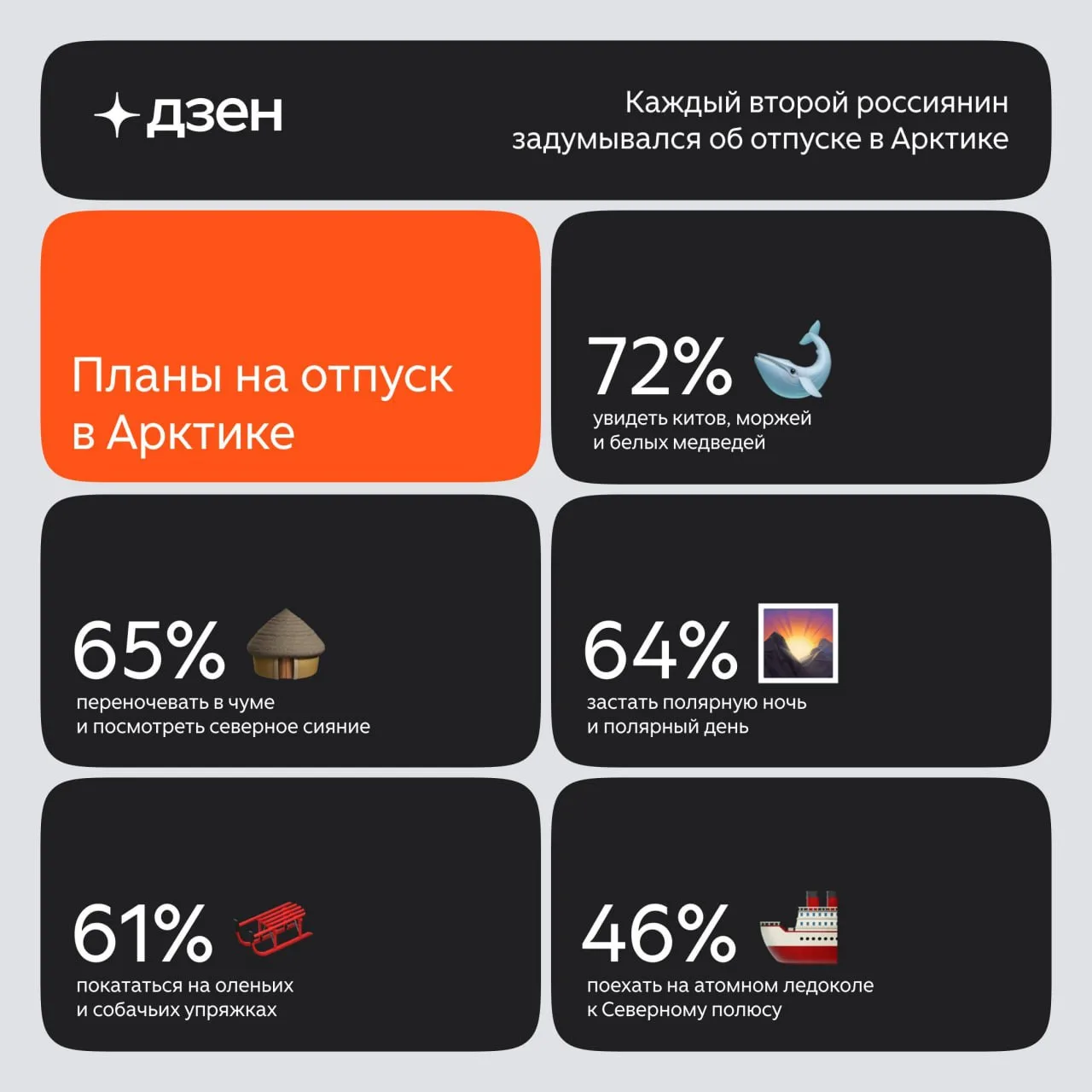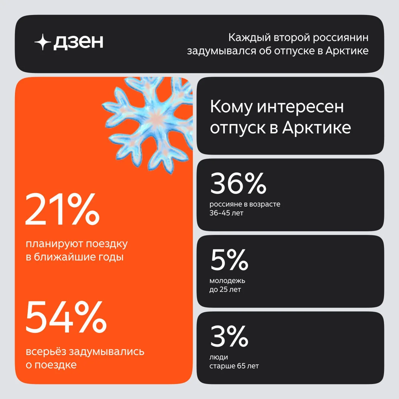 В России набирает популярность отдых в Арктике. Аналитики Дзена выяснили, что 54% россиян всерьёз задумывались о поездке на Север, а 21% даже планирует отпуск в ближайшие годы.