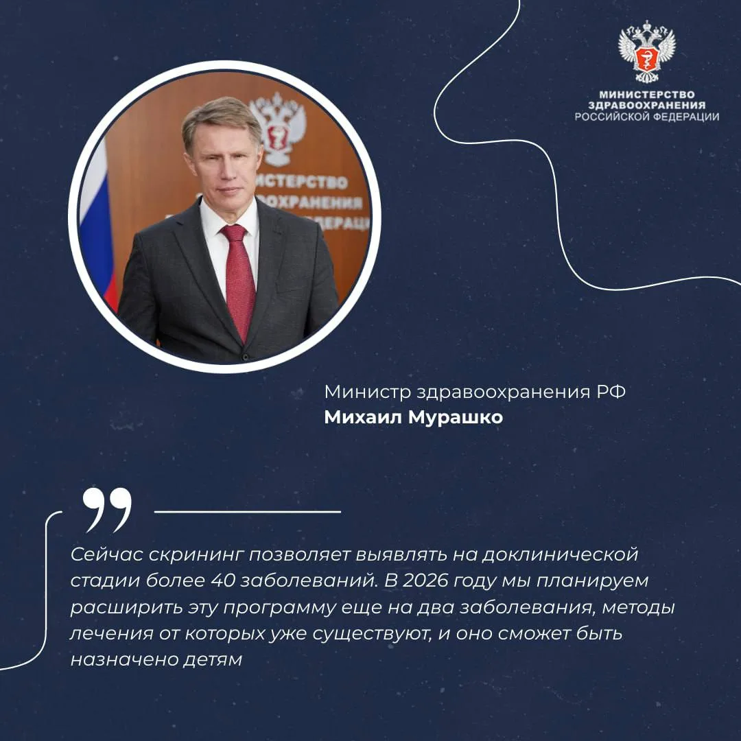 — Сейчас скрининг позволяет выявлять на доклинической стадии более 40 заболеваний. В 2026 году мы планируем расширить эту программу еще на два заболевания, методы лечения от которых уже существуют, и оно сможет быть назначено детям. Уже с 2026 года такая диагностика начнется по всей стране, — сказал он.