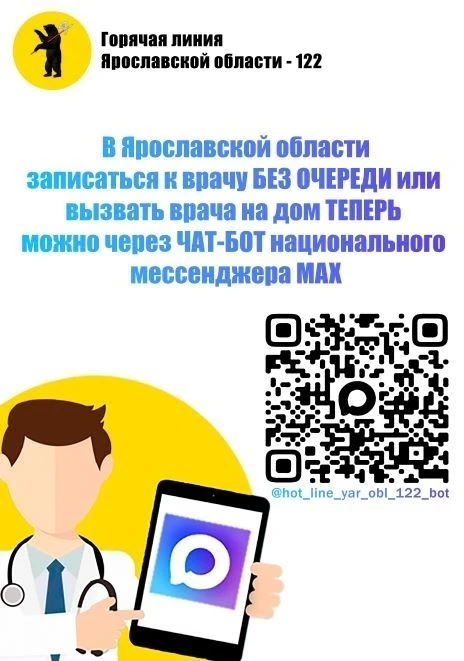 Помимо звонка в Единую регистратуру по номеру 122, сервиса «Интермед76» и очной записи в регистратуре, теперь жителям региона доступен ещё и официальный чат-бот Горячей линии Ярославской области – 122 в национальном мессенджере МАХ