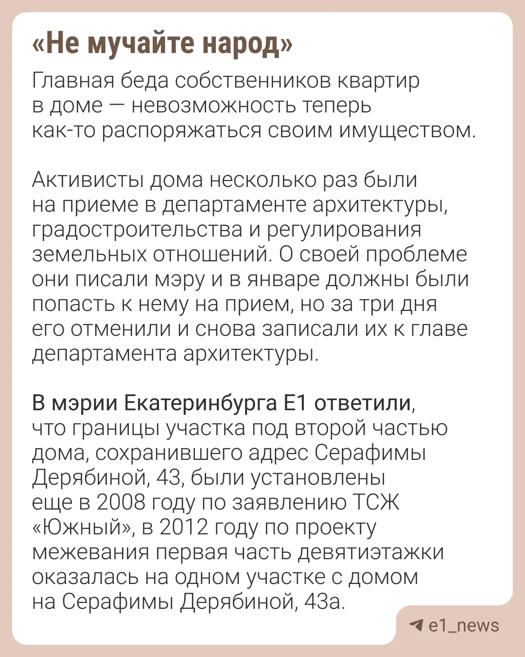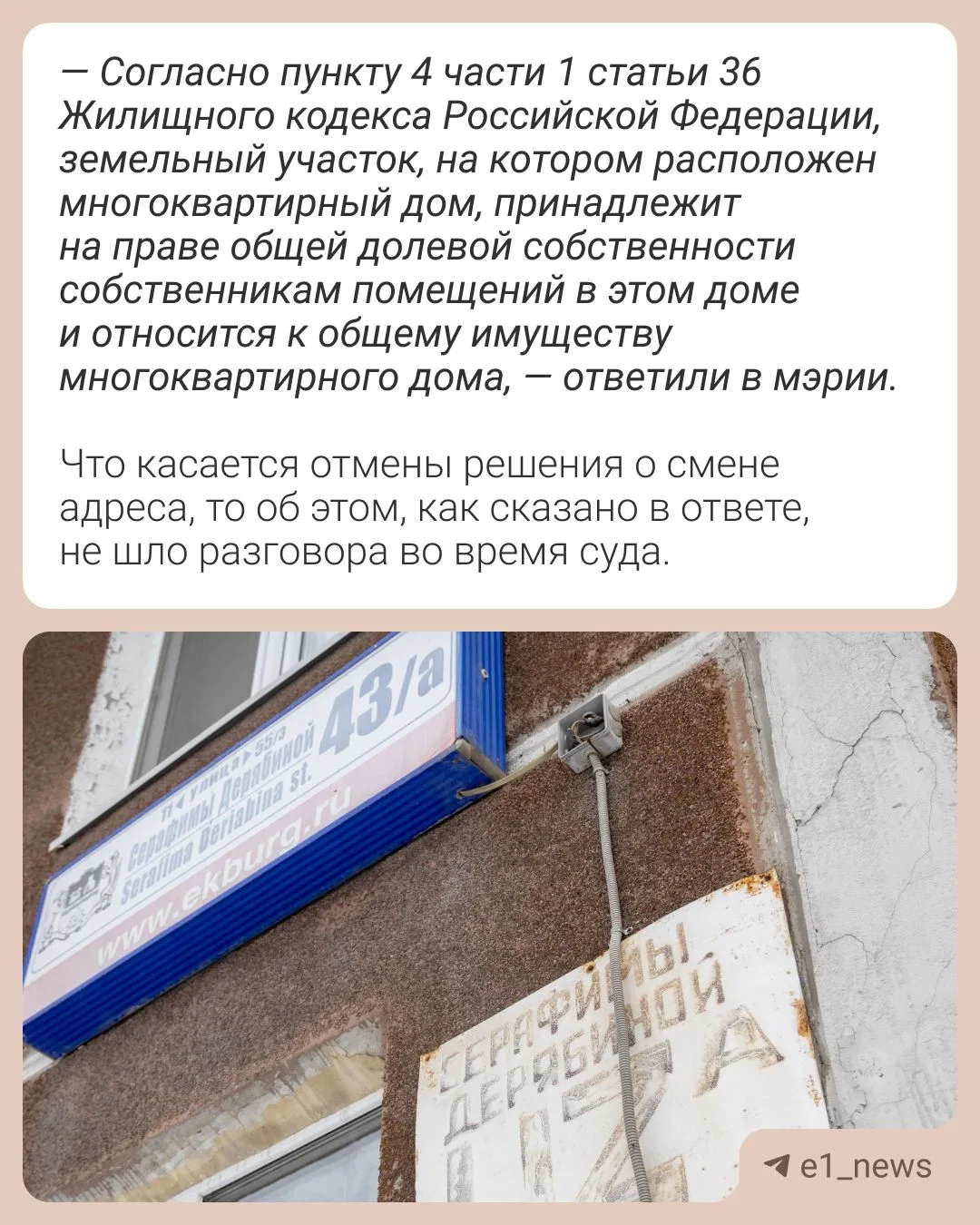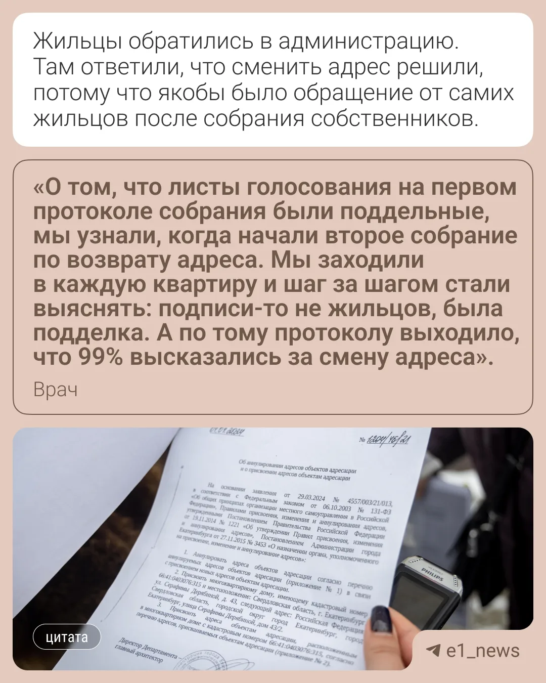 Возмущенные екатеринбуржцы обратились в администрацию. Там ответили, что адрес сменили, потому что это решили сами жильцы на собрании собственников. Только вот голосование оказалось поддельным, говорят читатели Е1.