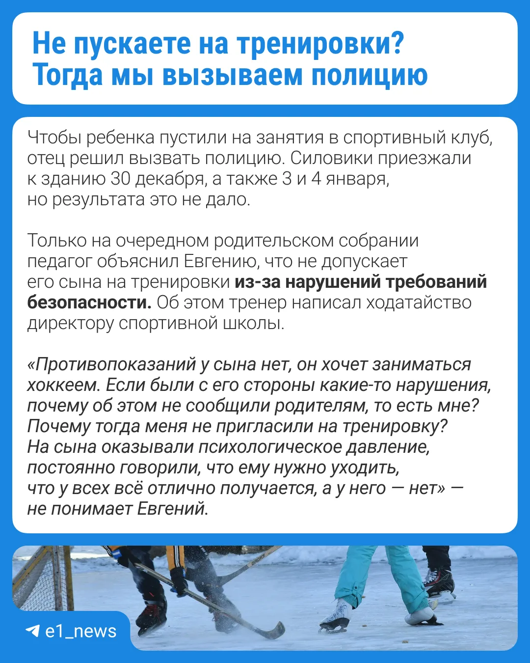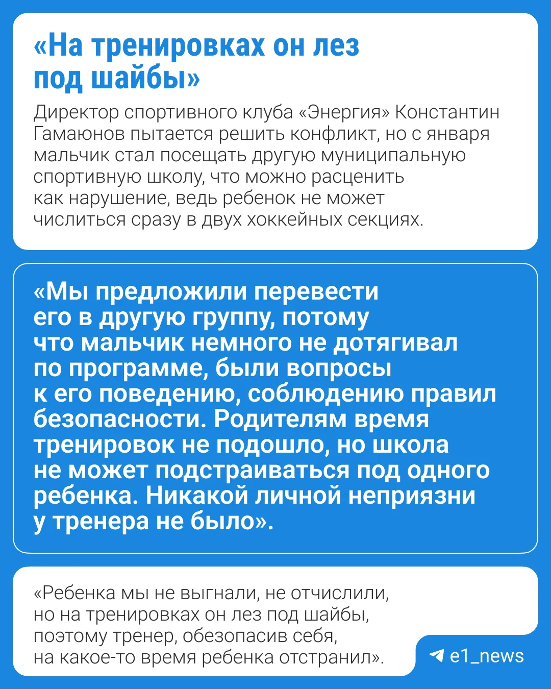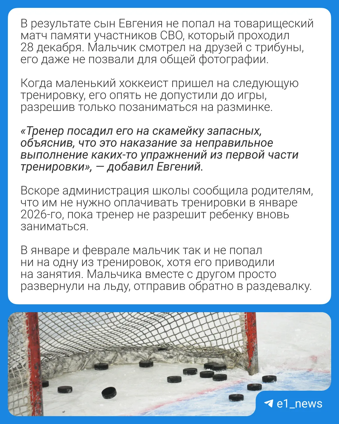 По его словам, сына отстранили от занятий из-за личной неприязни тренера и убеждали, что ему «не место в хоккее». В итоге без льда остались все 25 воспитанников команды.