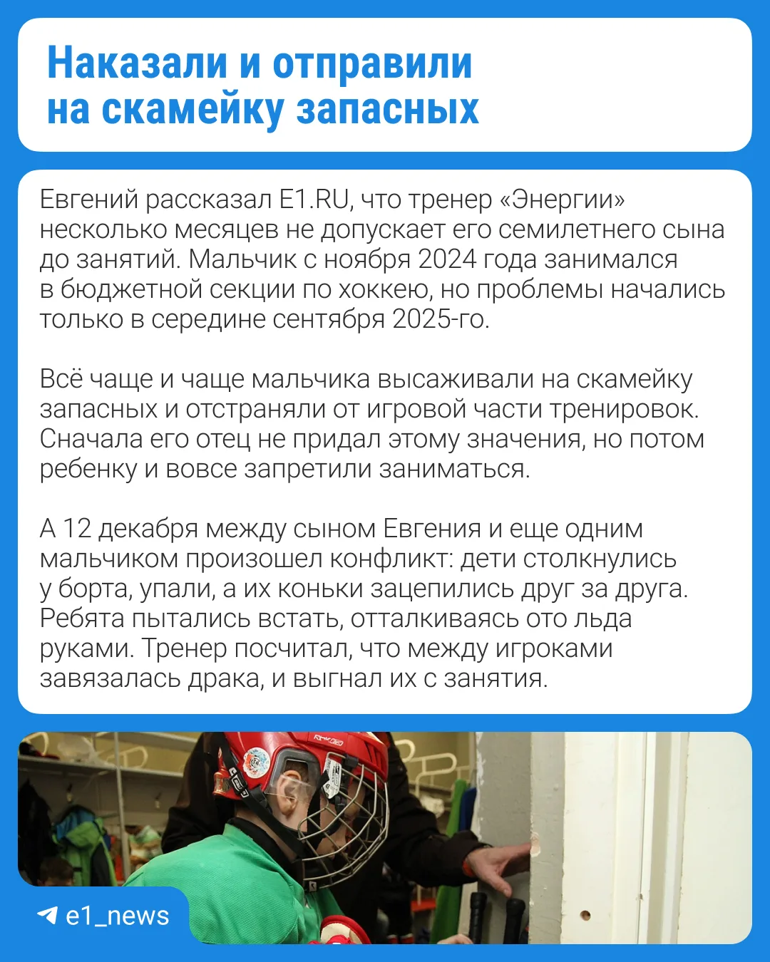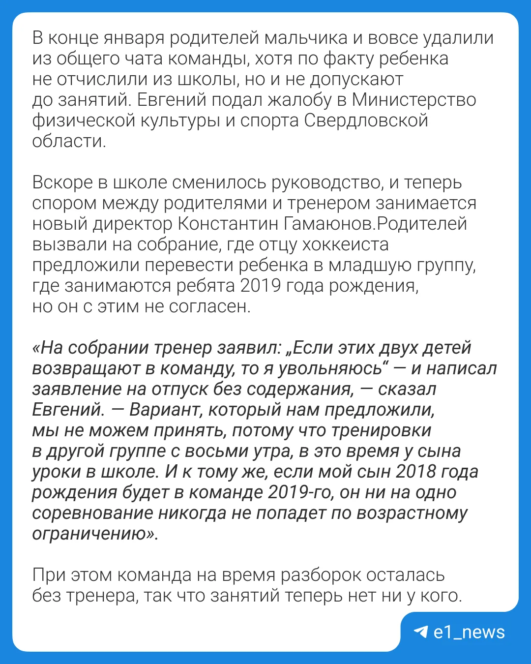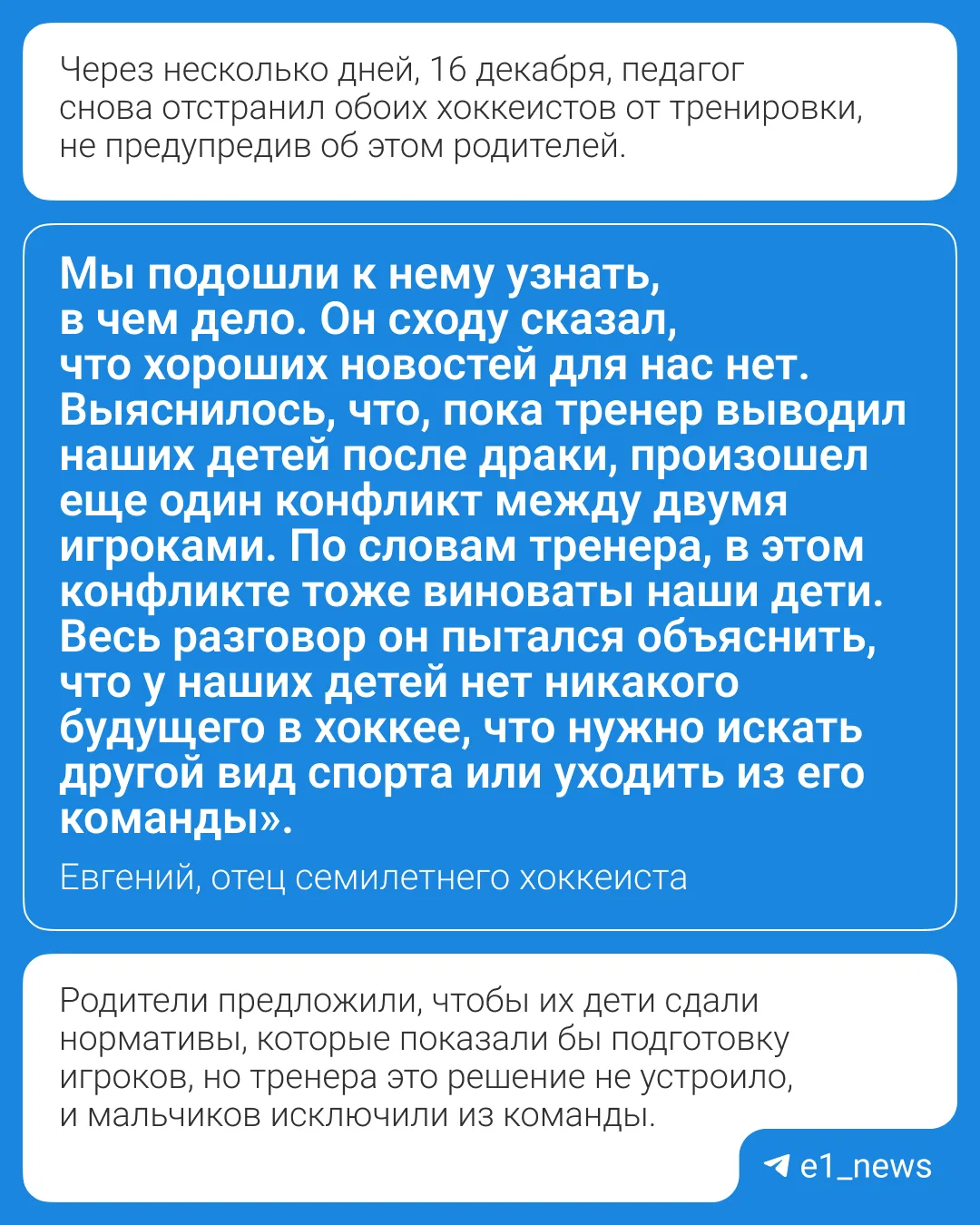 По его словам, сына отстранили от занятий из-за личной неприязни тренера и убеждали, что ему «не место в хоккее». В итоге без льда остались все 25 воспитанников команды.