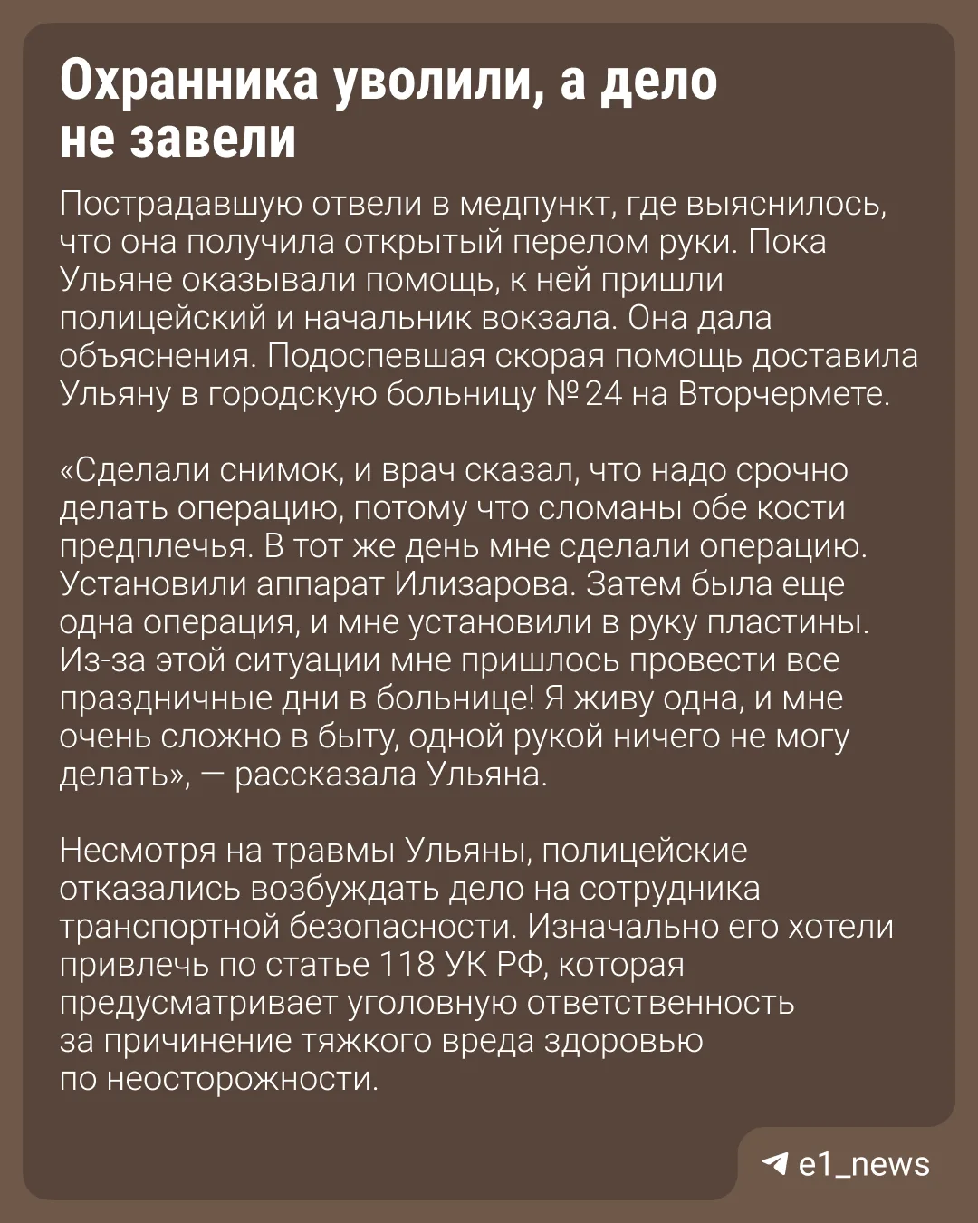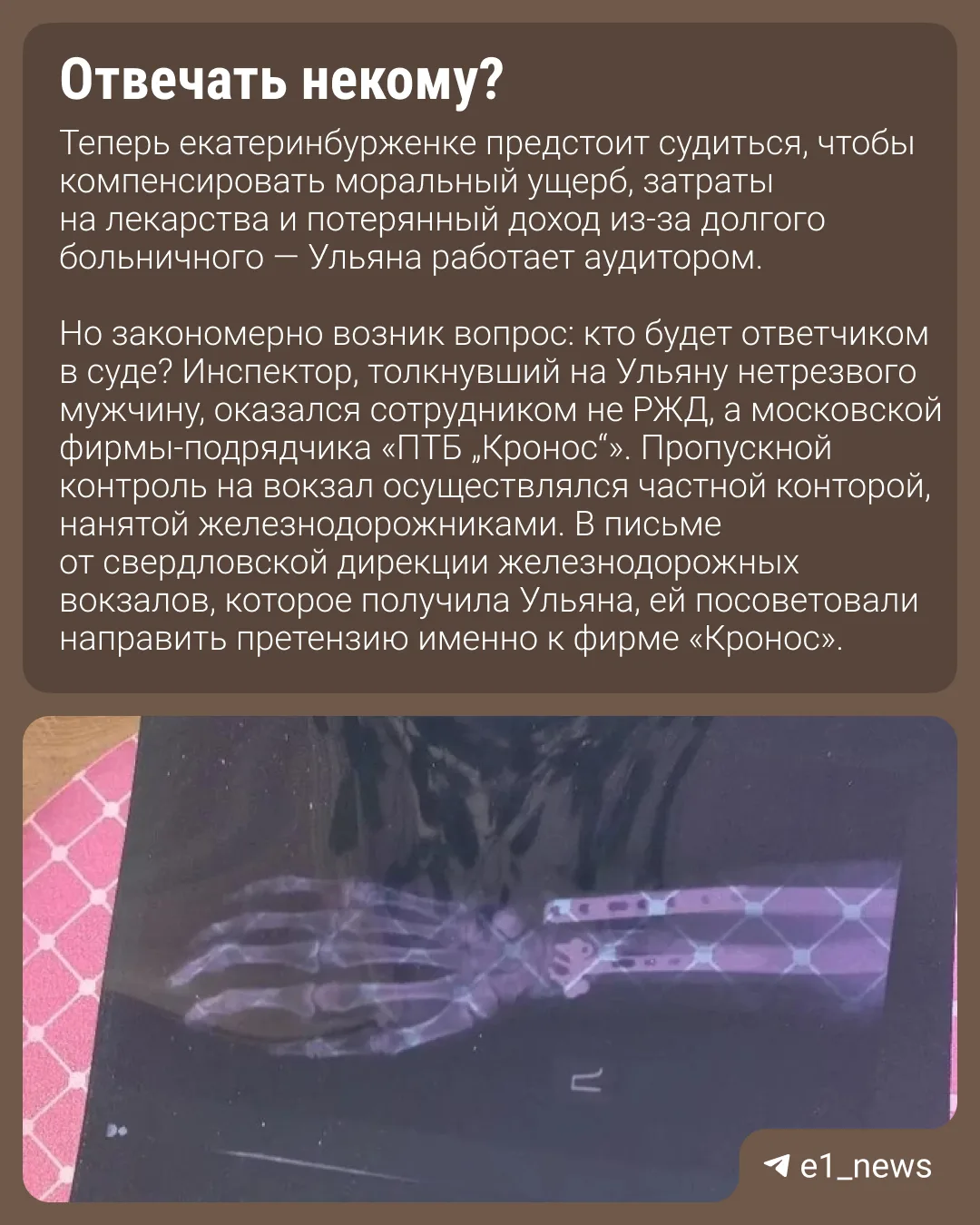 Екатеринбурженка Ульяна получила тяжелую травму на железнодорожном вокзале. Парадокс в том, что ей «помог» охранник, отвечающий за безопасность пассажиров. Из-за его неосторожного поступка пострадавшая долго лечилась, пропустила работу и не смогла навестить родителей в другом регионе.