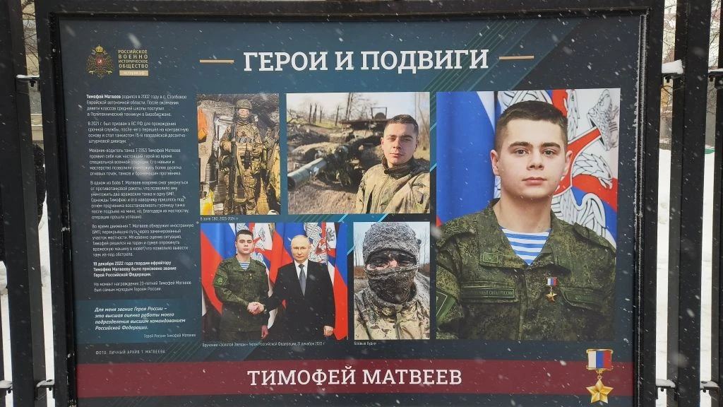 Стенд о нашем земляке — Герое России Тимофее Матвееве — вошел в новую экспозицию Российского военно-исторического общества. Открытие фотовыставки «Герои и подвиги» состоялось на Гоголевском бульваре в Москве в канун Дня защитника Отечества.