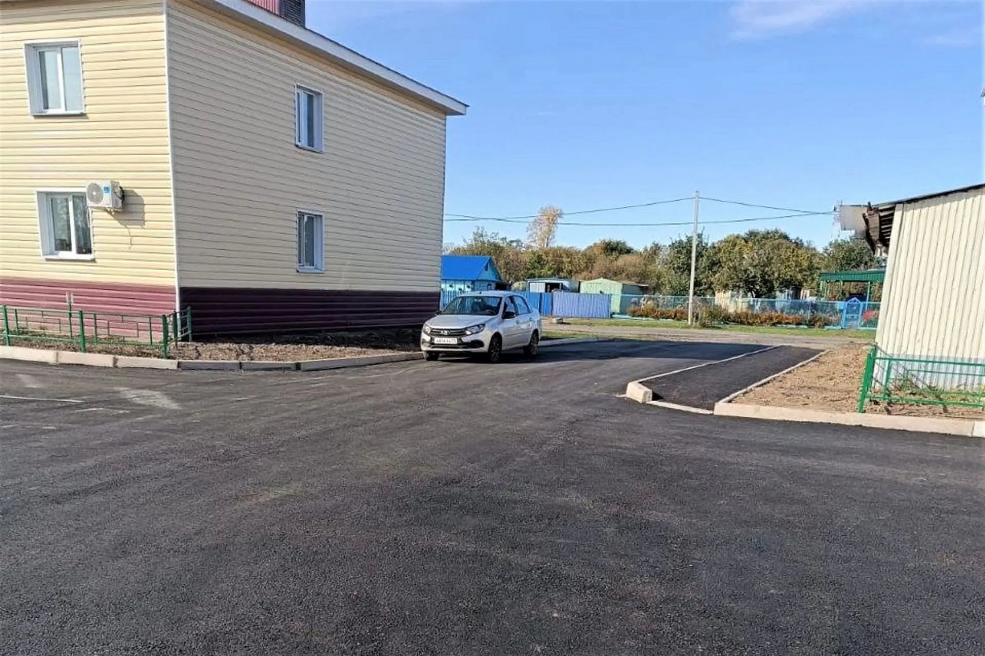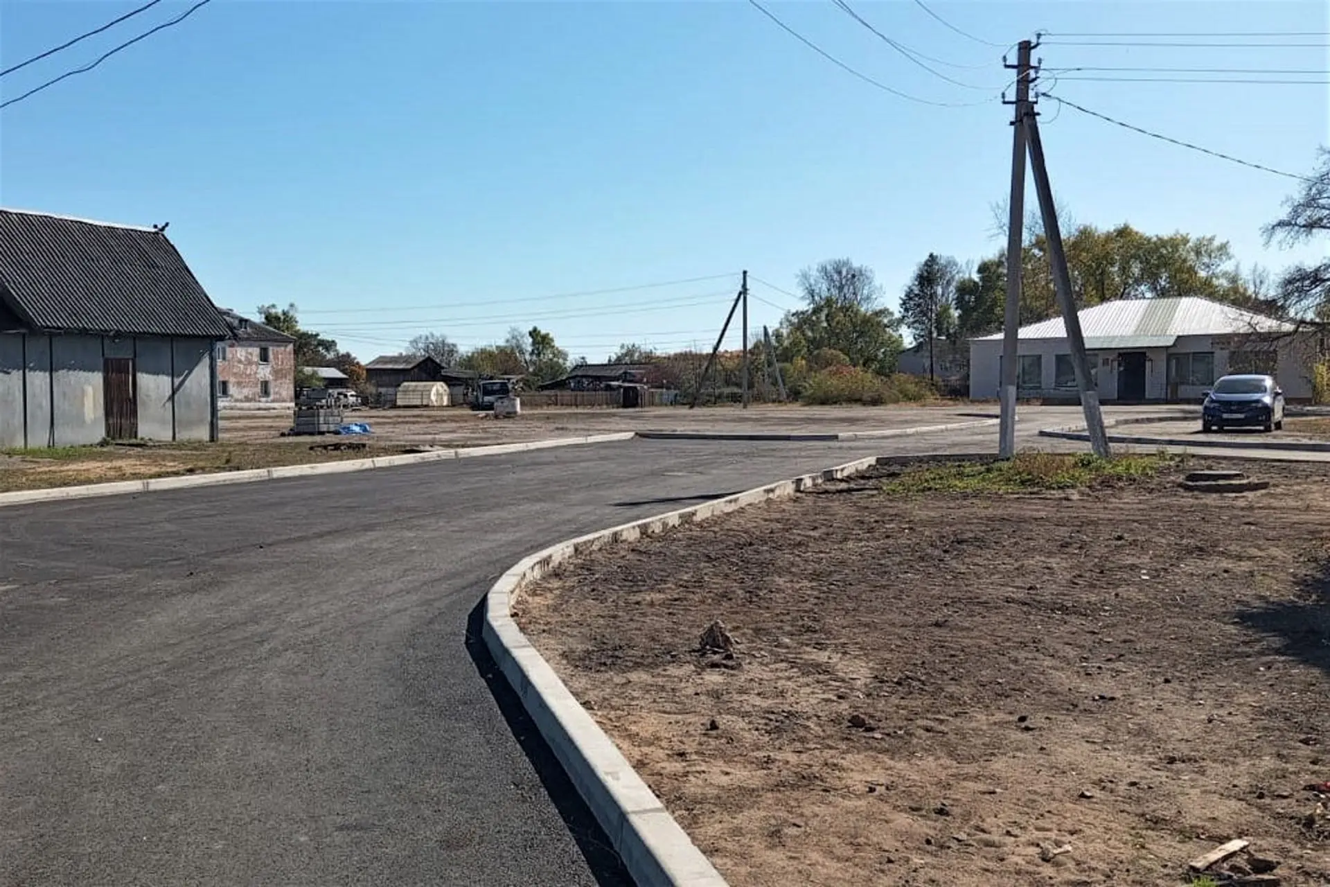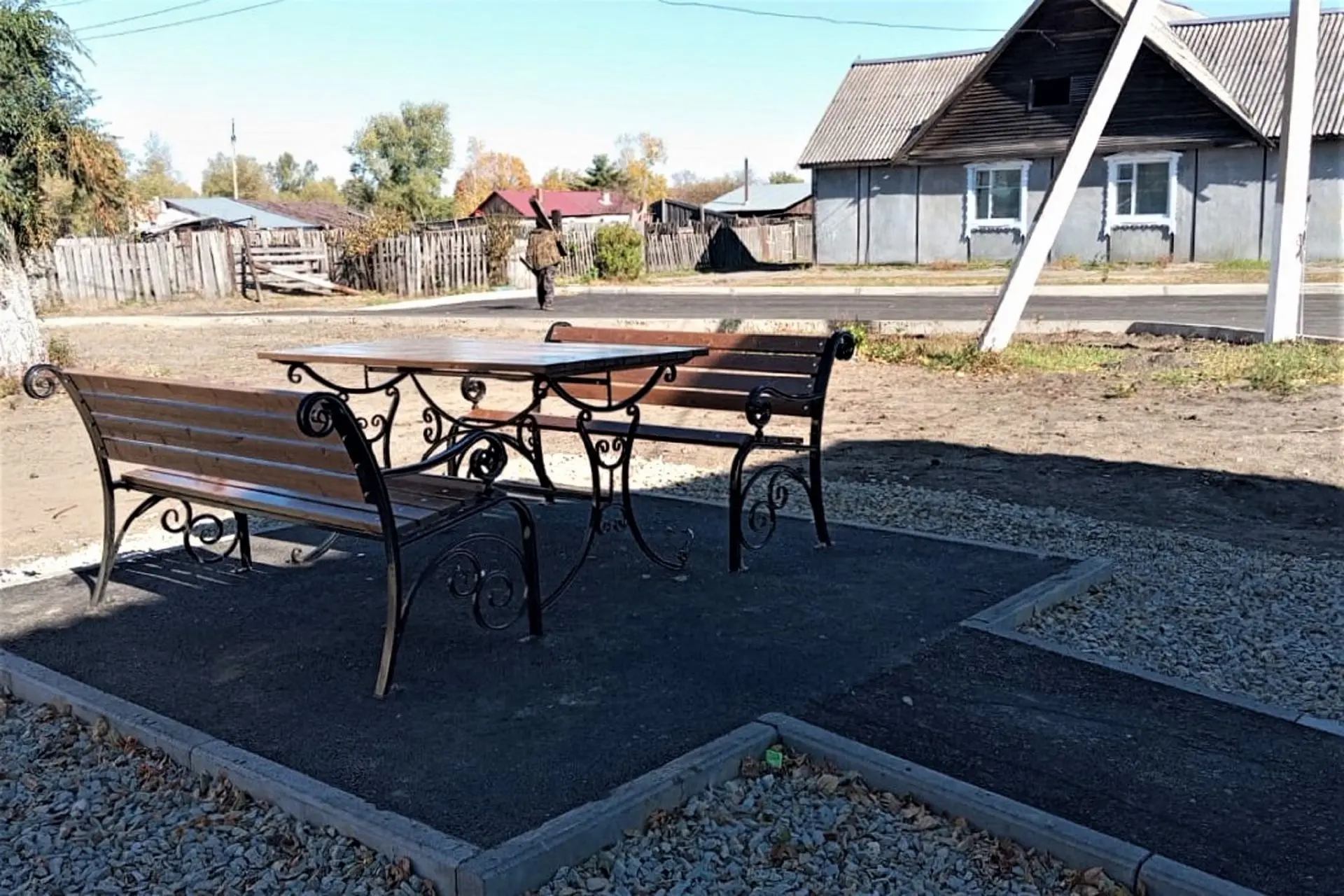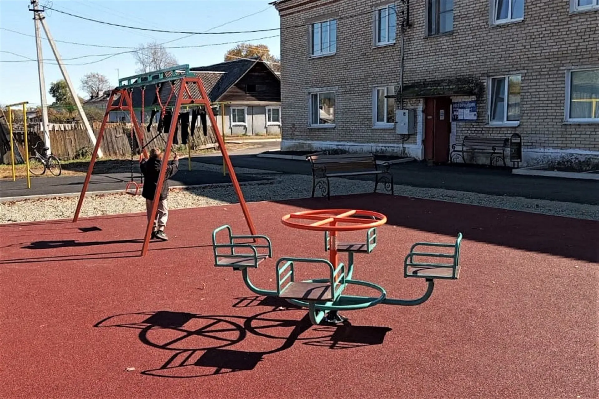 В селе Дубовое Биробиджанского района во дворе по Молодёжной улице обустроены проезды с бордюрами, отмостки по периметру домов, скамейки, качели и карусель для детей, площадки для сушки белья.