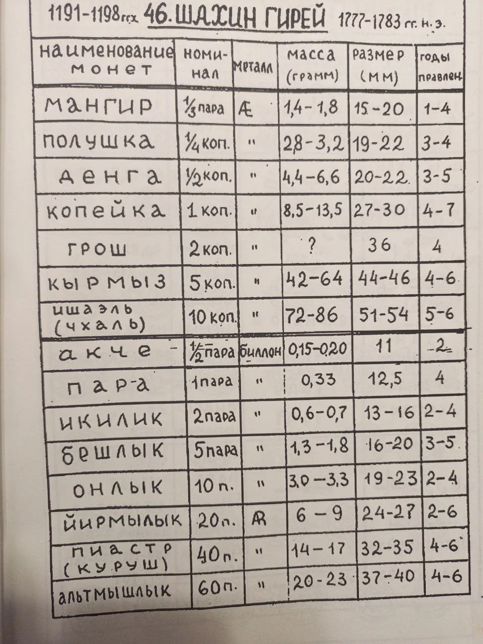Справочные данные по номиналам Шахин Гирея по Ретовскому.