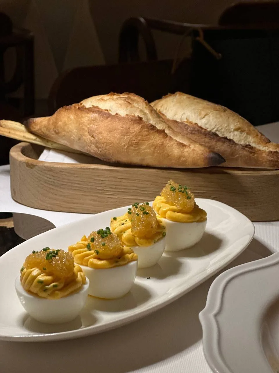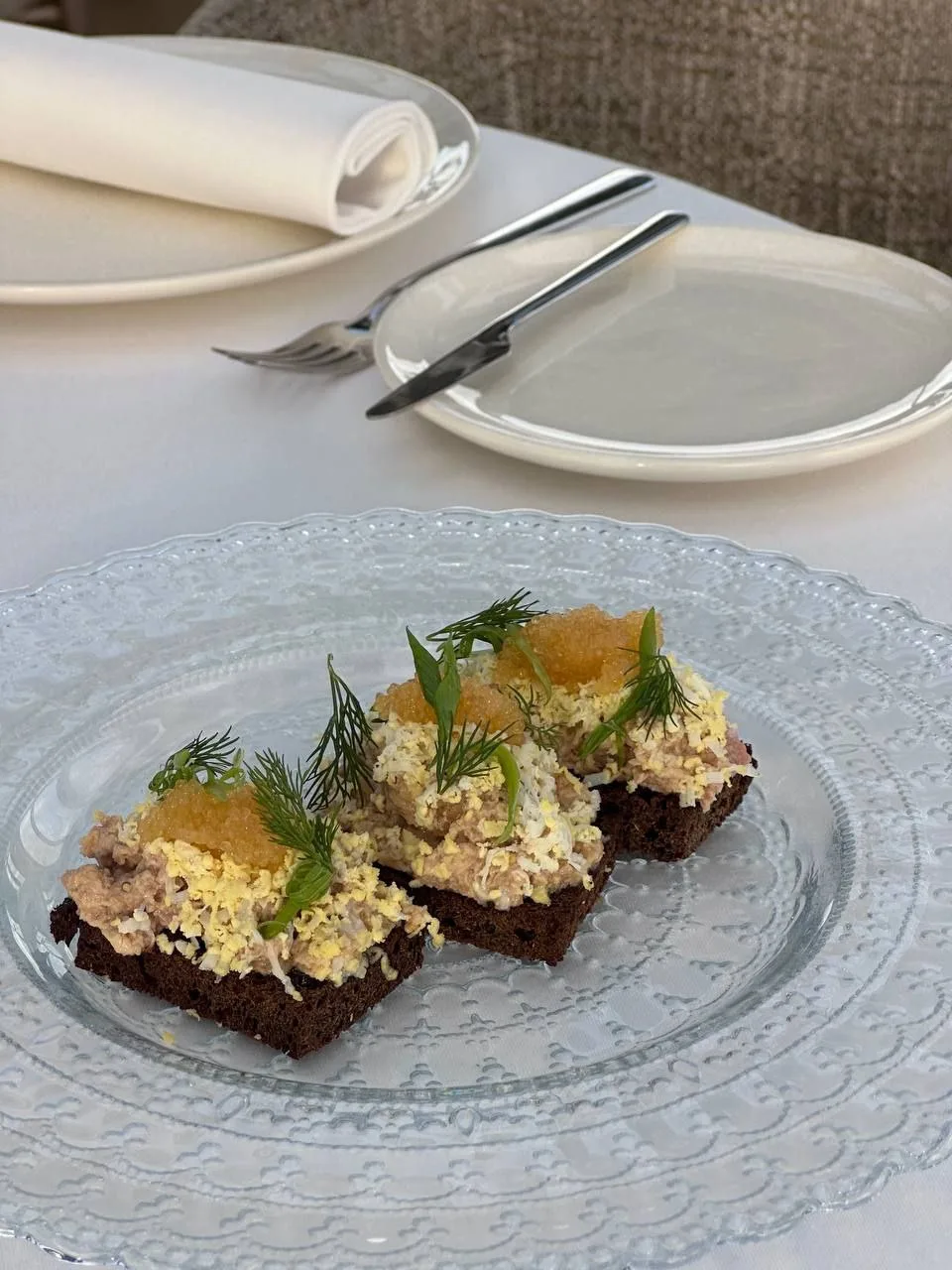 🥪 Тосты с печенью трески, перепелиным яйцом и щучьей икрой (1300 ₽) — фаворит