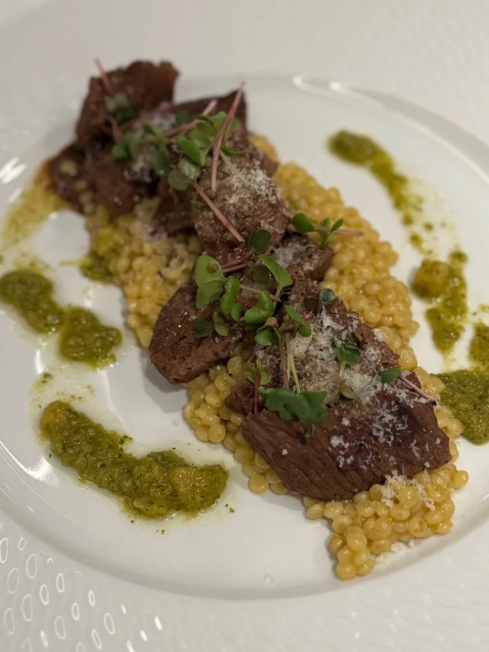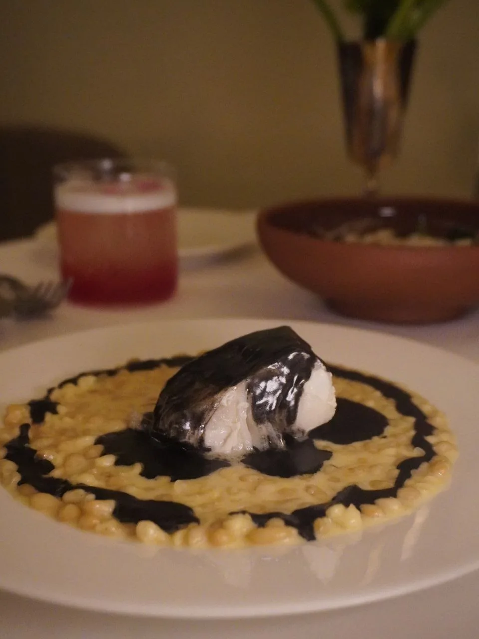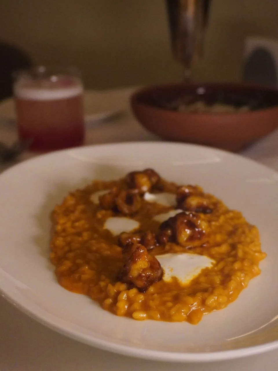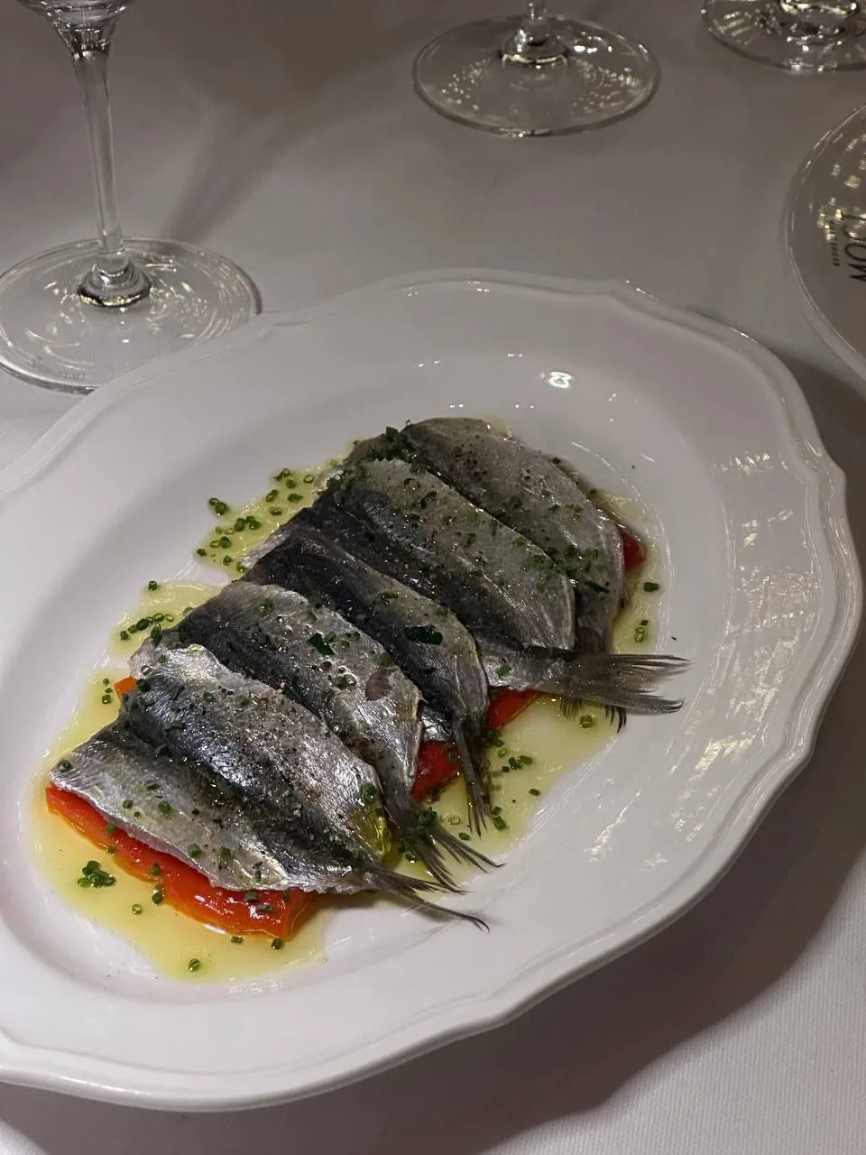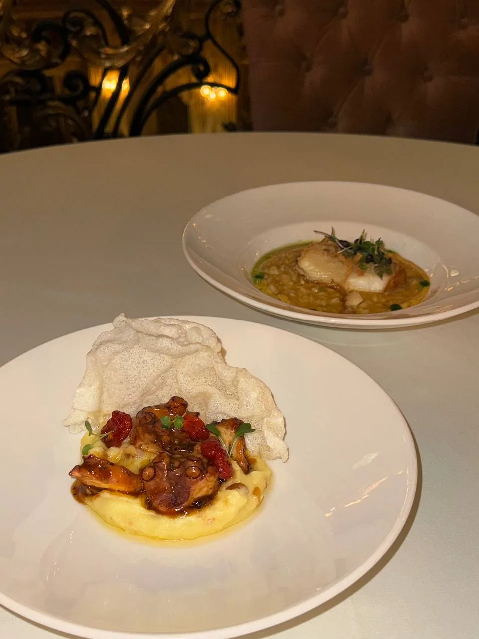 Ресторан средиземноморской кухни на Ленинградском проспекте. Крудо гребешок, апельсин (1050 ₽), Ризотто с креветками и цукини (1200 ₽).