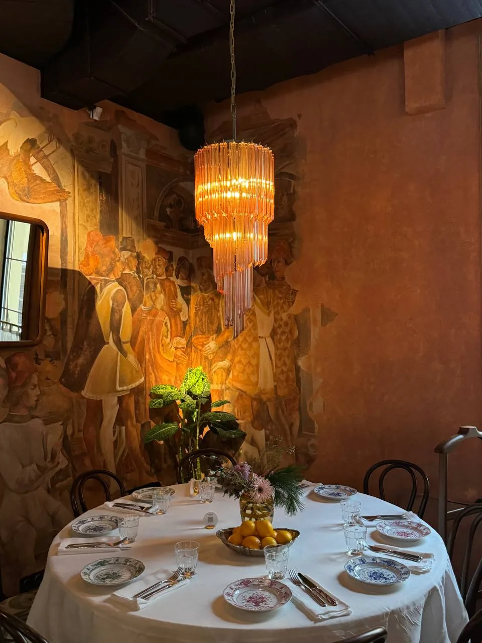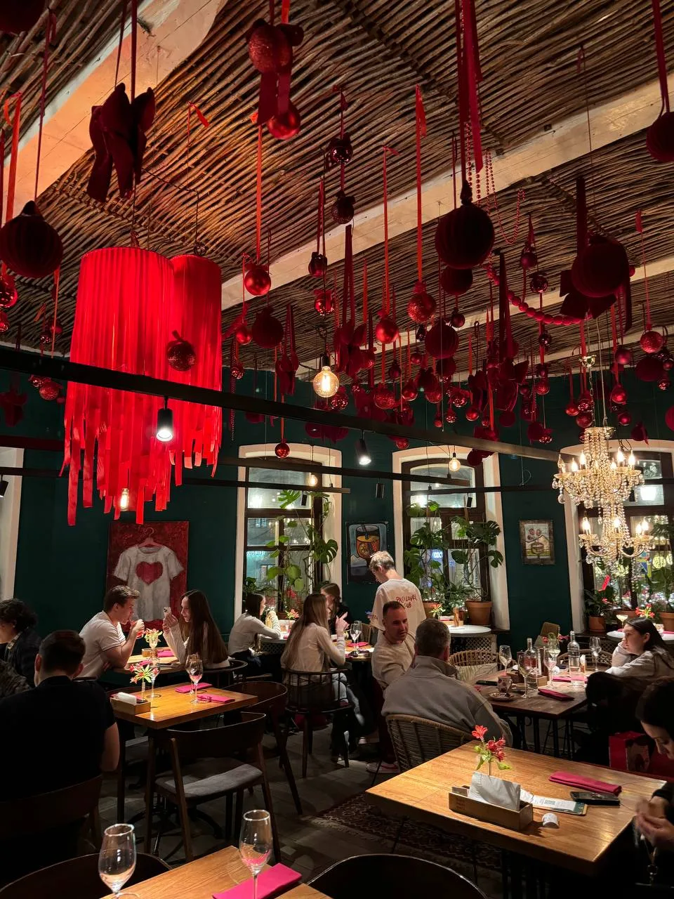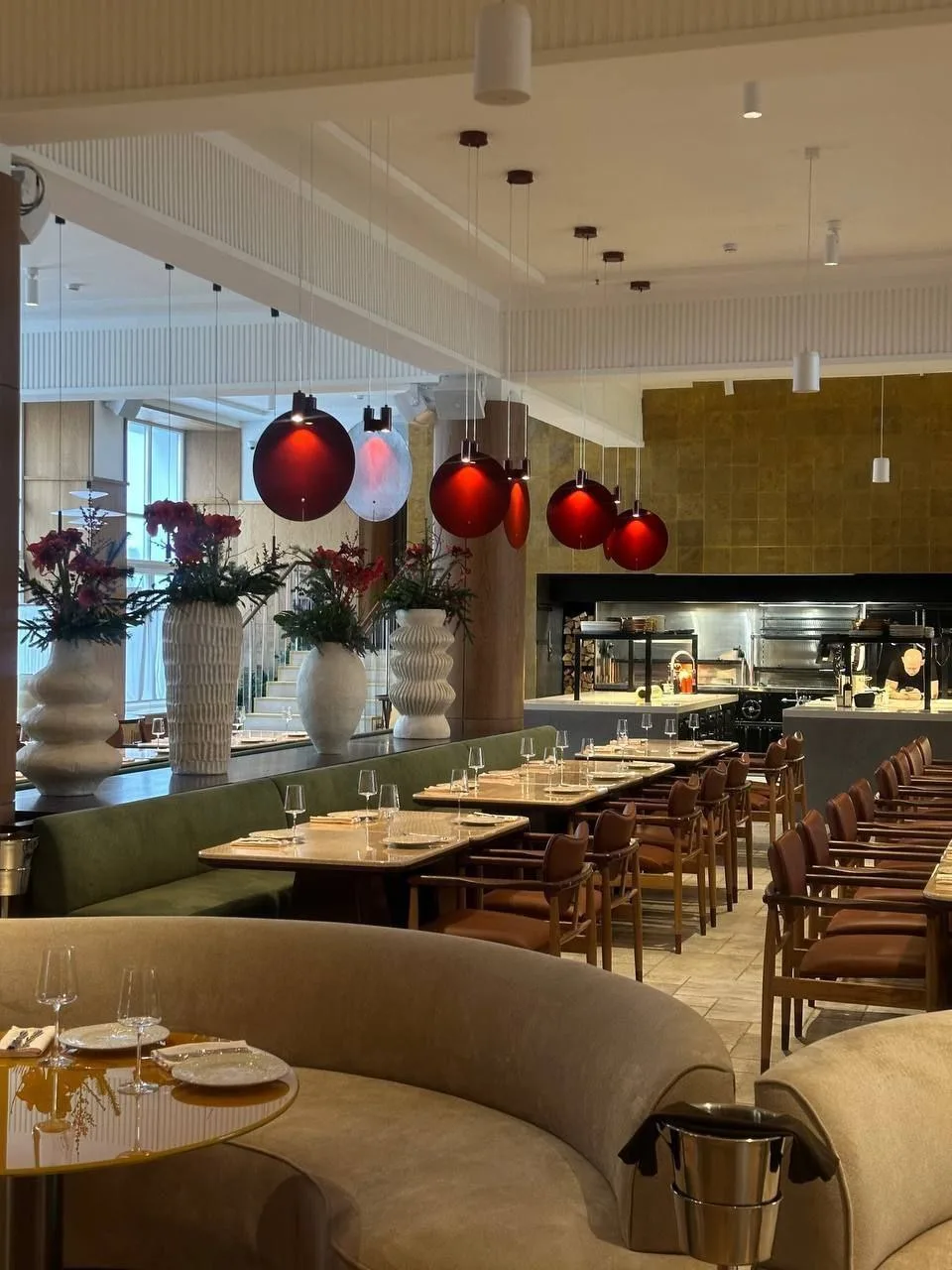 Ощущение загородного дома возникает с порога: три зала, приглушённый свет, свечи, цветы на столах, яркие картины и белые скатерти. В интерьере много живой зелени и красных акцентов, а сердце кухни — дровяная печь, привезённая из Италии.