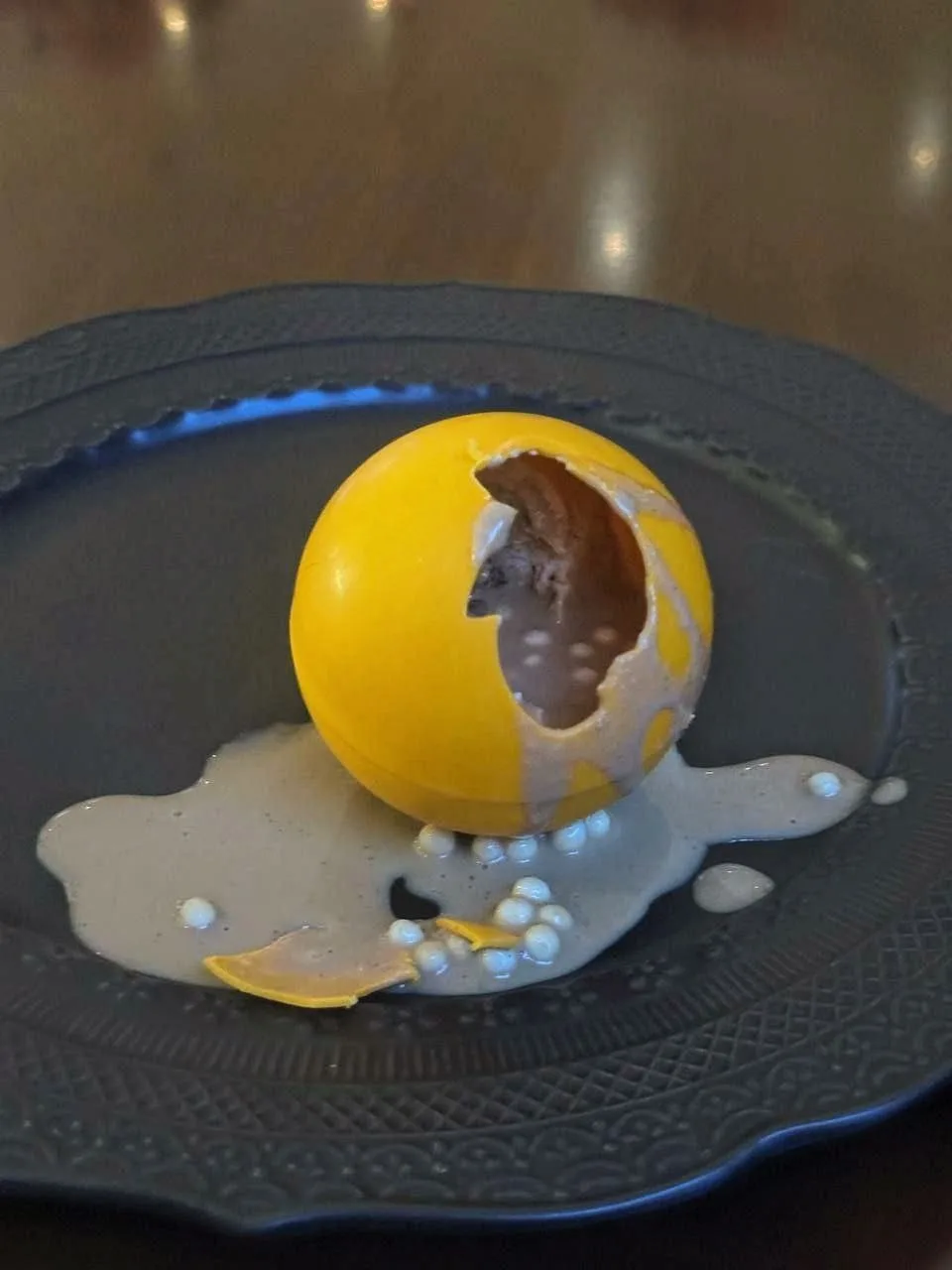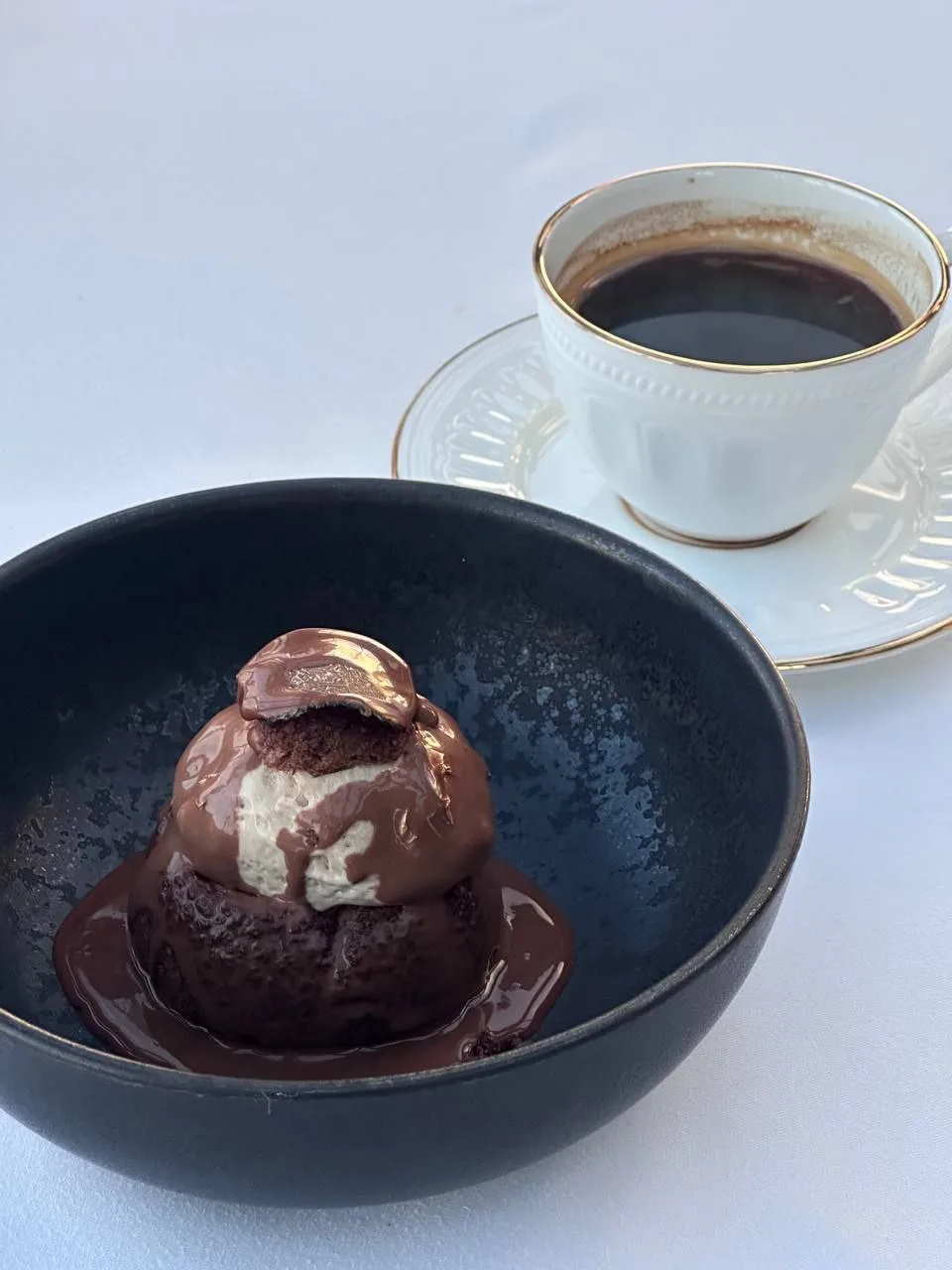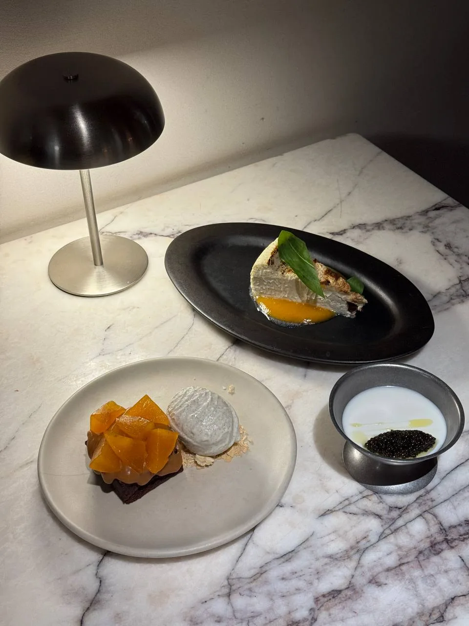 🍫 Копченый брауни с мисо карамелью, пломбиром и хурмой (900 ₽) — шикарный десерт