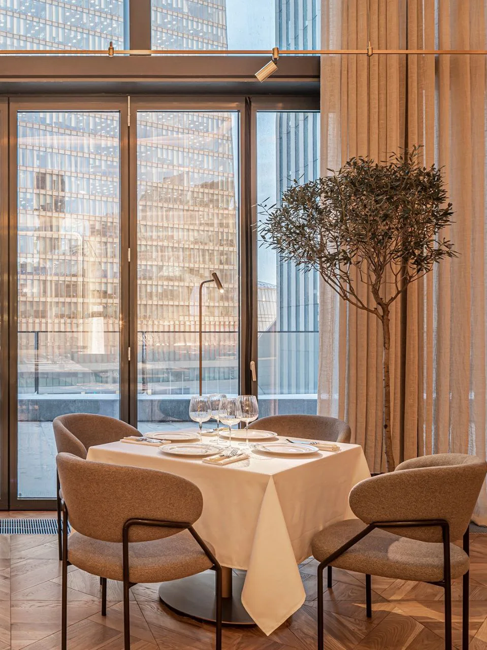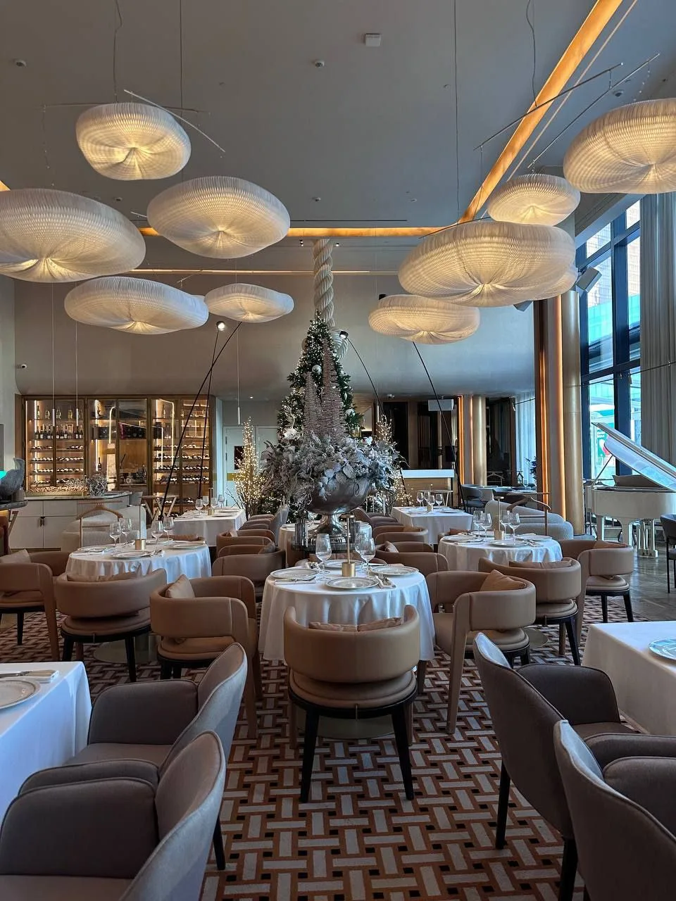 Интерьер выдержан в классической бежевой гамме с роскошными люстрами, большими окнами и акцентами в виде живых аквариумов. Для особых случаев здесь есть уникальный стеклянный зал-куб, парящий в небе над городом.