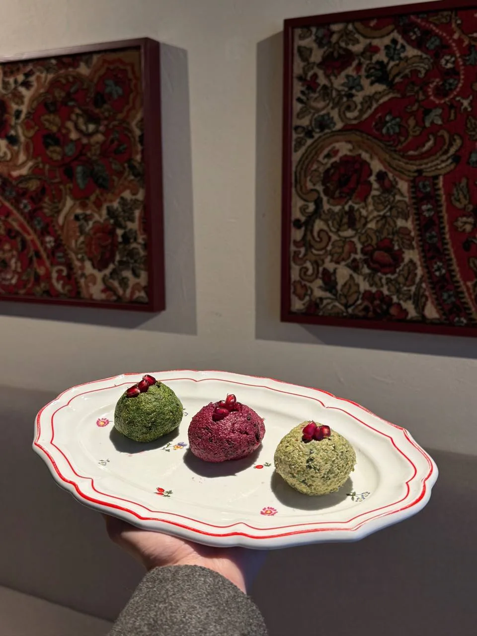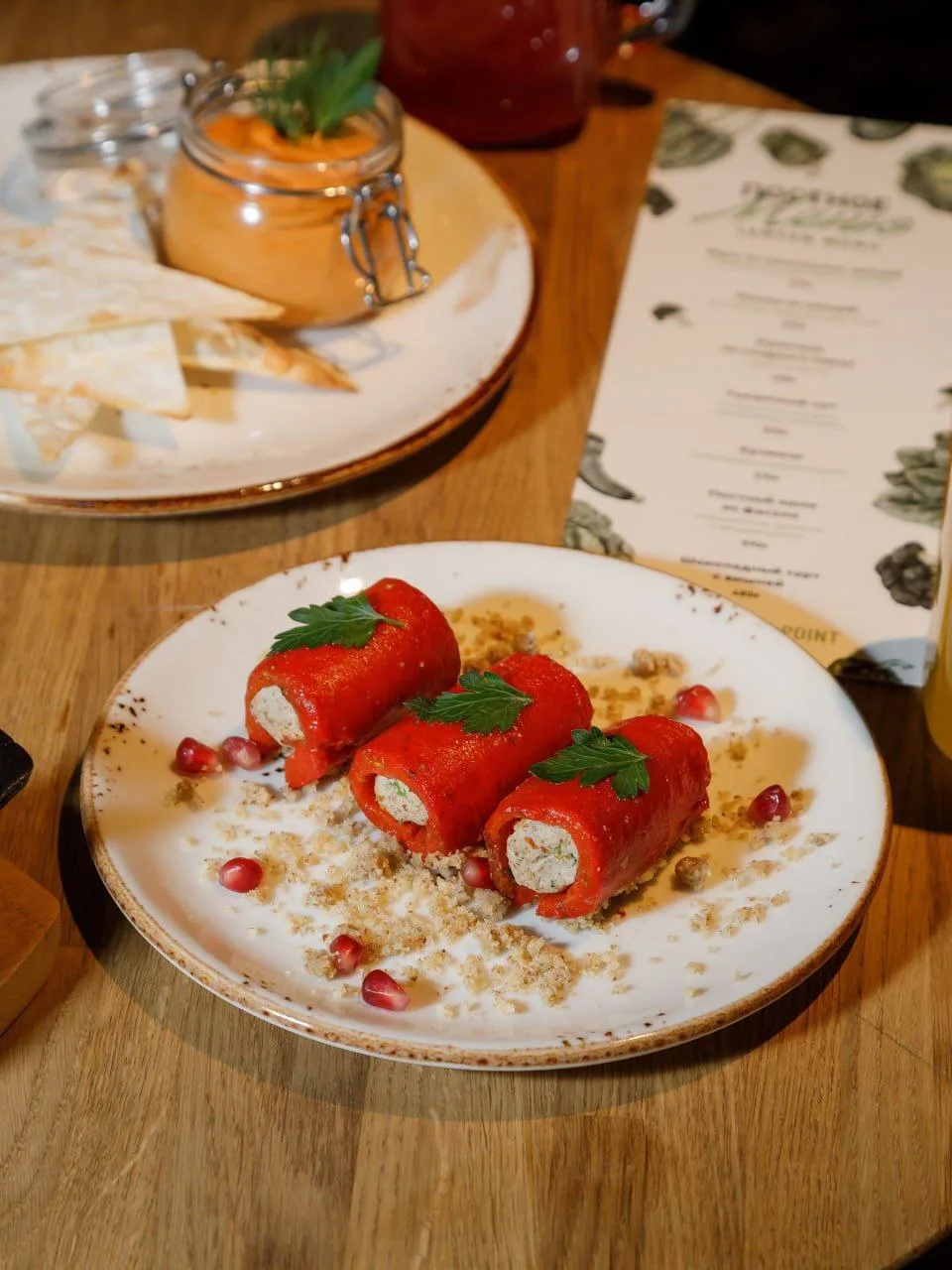 В грузинском бистро акцент на овощи, специи и ту самую грузинскую глубину вкуса: Мусс из запечённых овощей, Рулетики из сладкого перца с грецким орехом, Релиш из овощей, Постный люля из фасоли, Шоколадный торт с вишней.