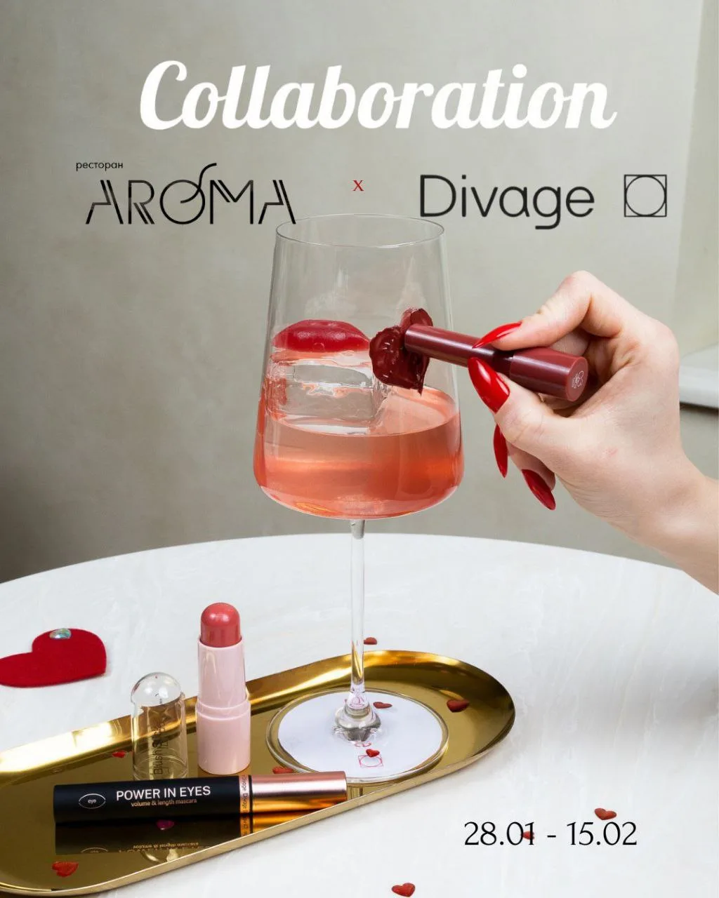 В ресторане запустят специальное меню с брендом декоративной корейской косметики JCos. При заказе блюда Яйцо бенедикт с лососем на вафле из цукини (1050 ₽) гость получит тональный CC-крем. К тарталетке с клубникой (650 ₽) подарят тушь для ресниц, к Беллини б/а (900 ₽) — блеск-бальзам для губ. С 1 по 15 марта.