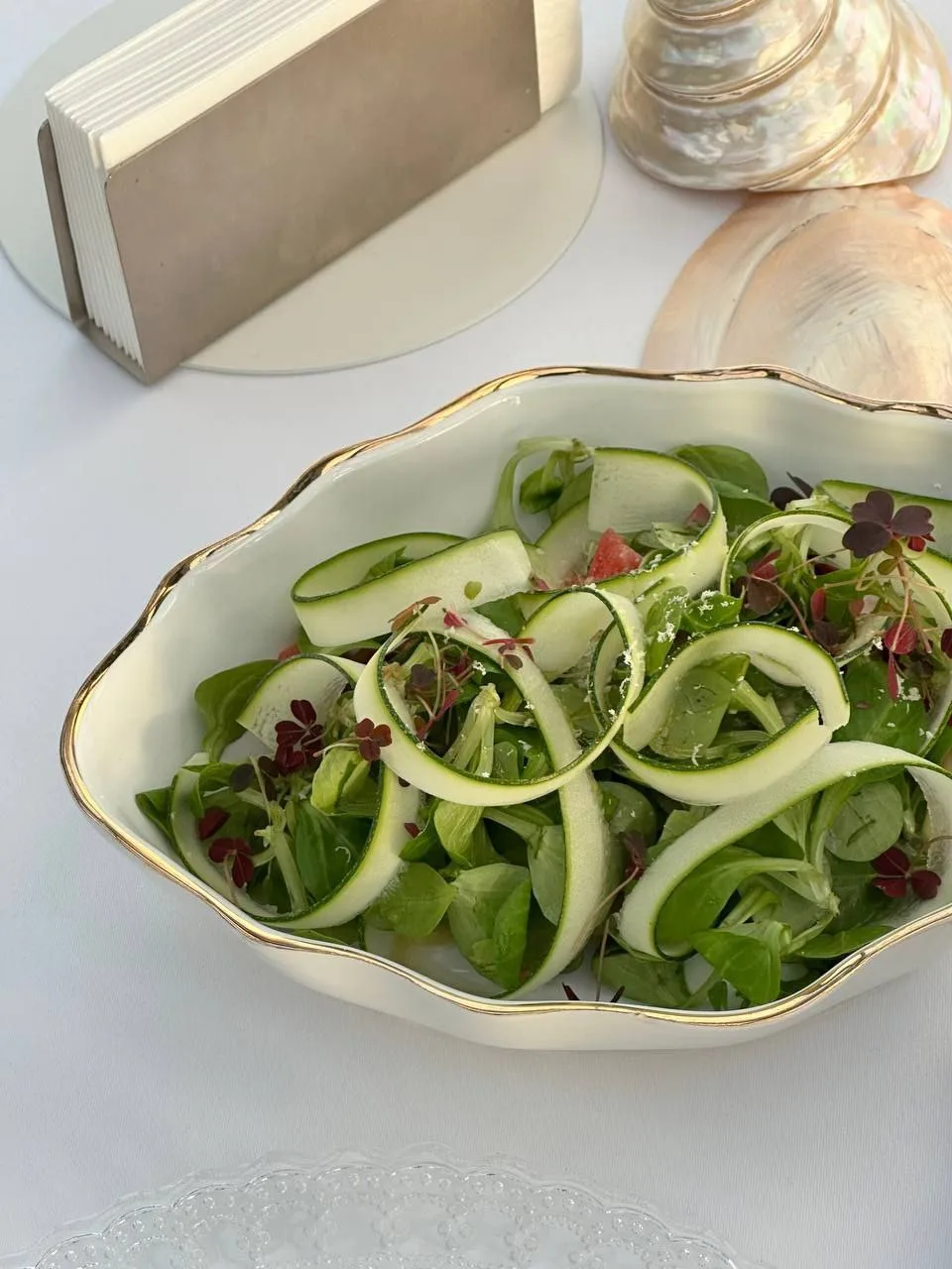 Средиземноморская кухня с акцентом на свежую рыбу и морепродукты c эффектными шоу-подачами. Креветки темпура, васаби крем (1450 ₽), Тальолини с креветками (1600 ₽).