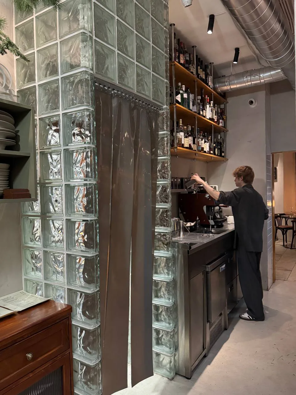 Камерное пространство без кричащего дизайна: на потолке 75-летняя амбарная доска, на подоконниках канделябры со свечами, которые догорая, превращаются в уникальное произведение искусства. Стена из стеклоблоков, отделяющая кухню от зала, создает некий театр теней, за ним приятно наблюдать во время ожидания блюд.