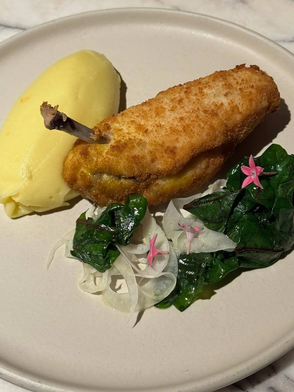🍗 Киевская котлета с черной икрой, пюре и мангольдом (1950 ₽) — по-новогоднему теплое блюдо