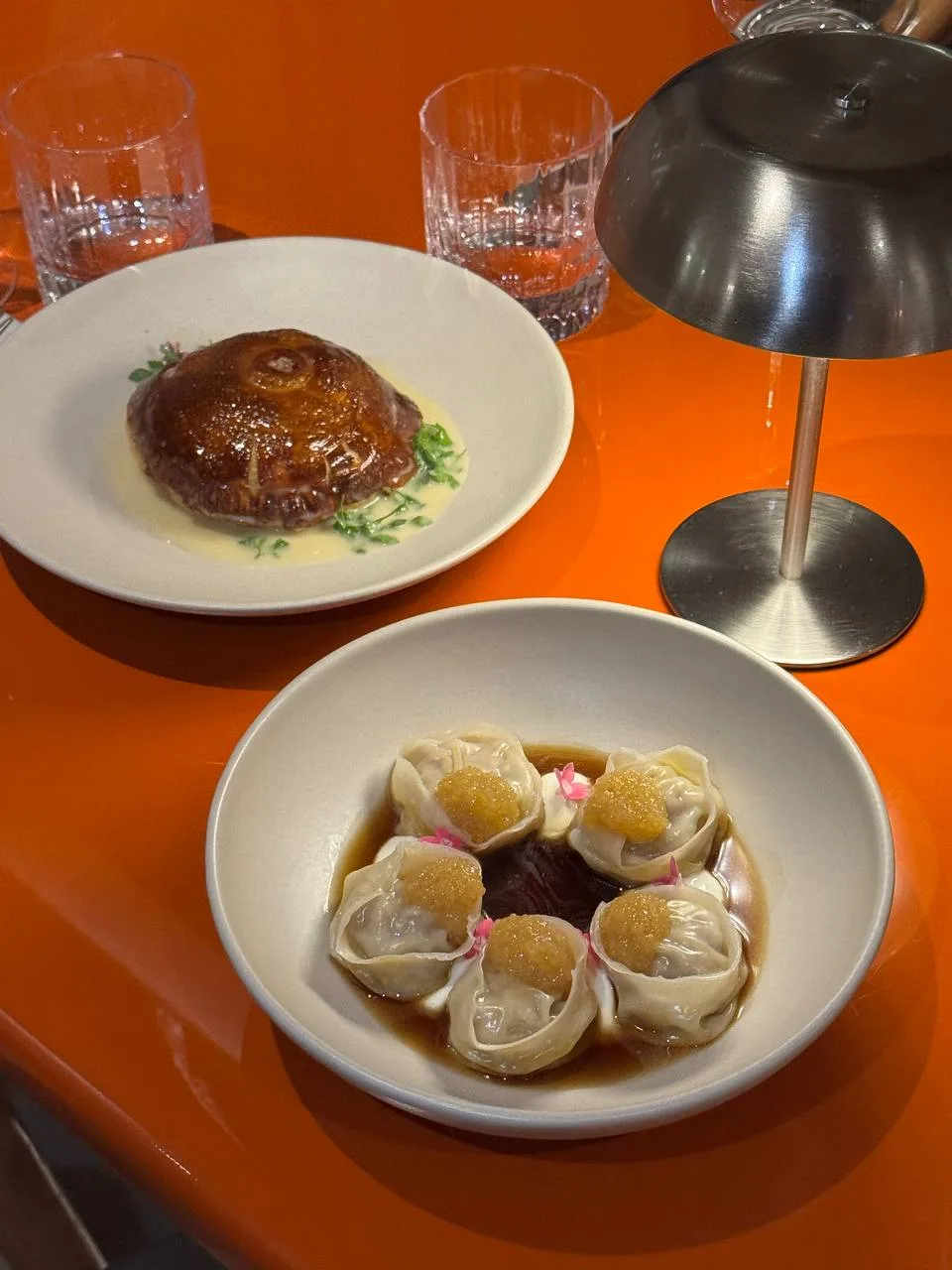 🥟 Пельмени с копченой щукой и фуагра, бульоном из грибов и сена (2100 ₽) — богатый оригинальный вкус, фаворит
