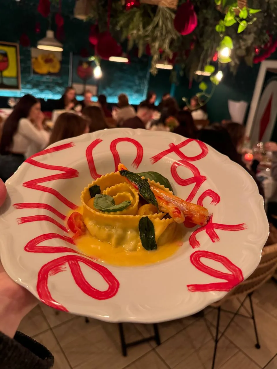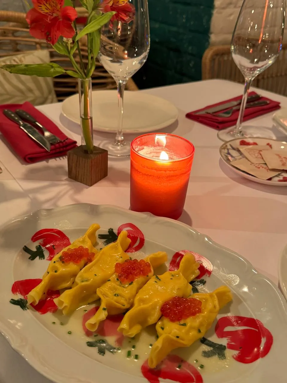 🍝 Карамелле с лангустином, креветкой и красной икрой (1100 ₽) — фаворит вечера
