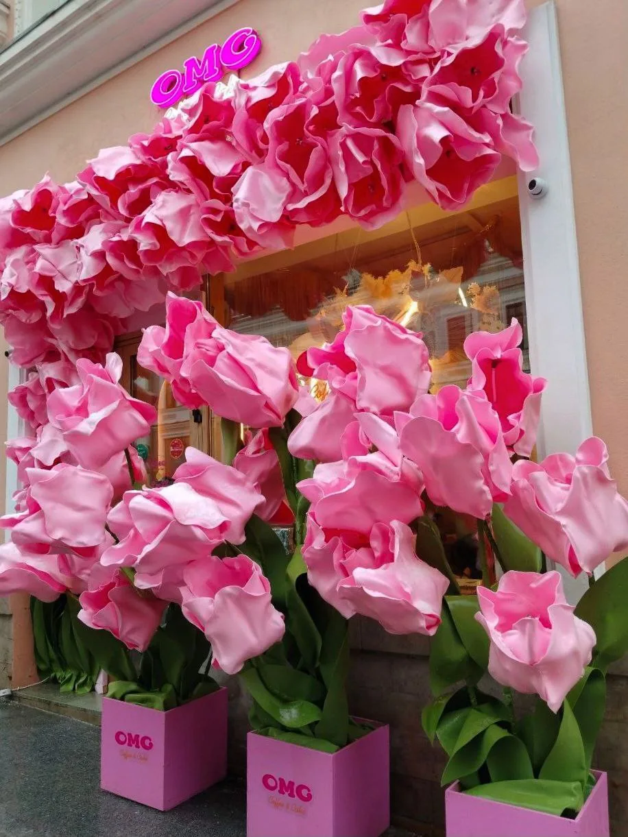 OMG Coffee&Cake вновь порадовали милым фасадом, на этот раз здесь нежные розовые цветы.