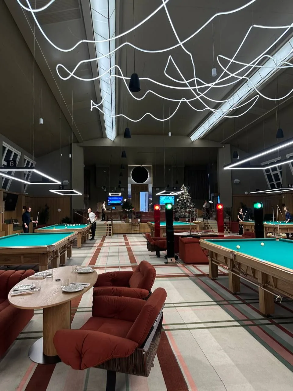На верхних уровнях царит дух игры: 21 бильярдный стол (включая fidgetal с проекцией и ассистентом на ИИ), приватные залы, музейная экспозиция и караоке. А для семейных визитов оборудована огромная детская зона с услугами няни.