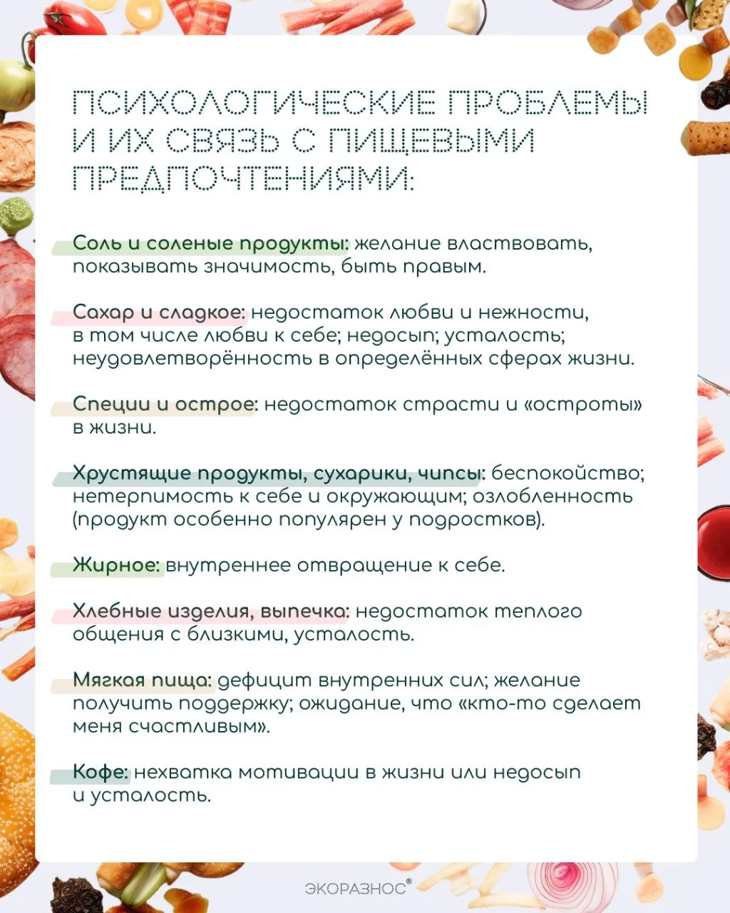 Так, за тягой к определенным продуктам могут скрываться наши тайные психологические проблемы, какие именно рассказали на изображении выше 👆🏻