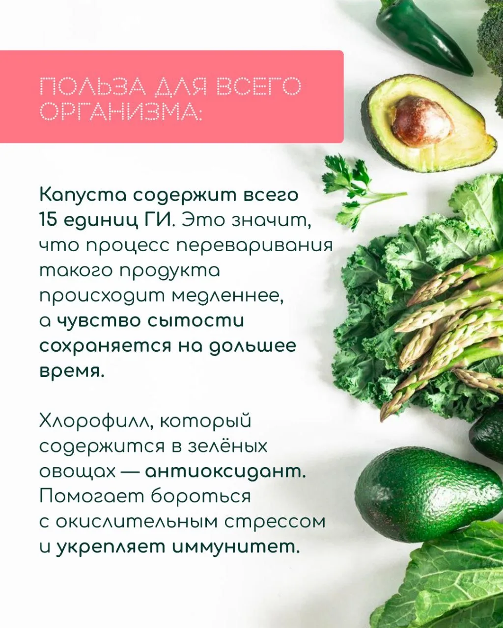 ✅ Капуста — клетчатка, витамины и минералы, необходимые для хорошего пищеварения.