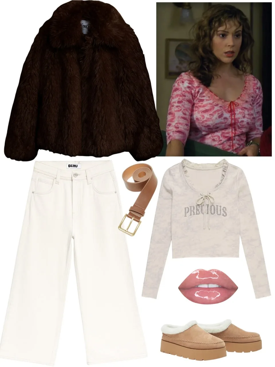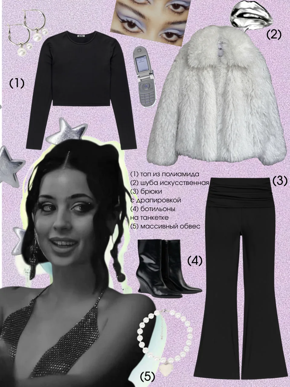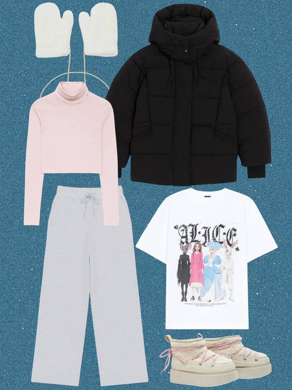 Вот она — формула уютного шика: тёплая шуба, мягкий лонгслив, спортивные штаны и остроносые ботильоны.