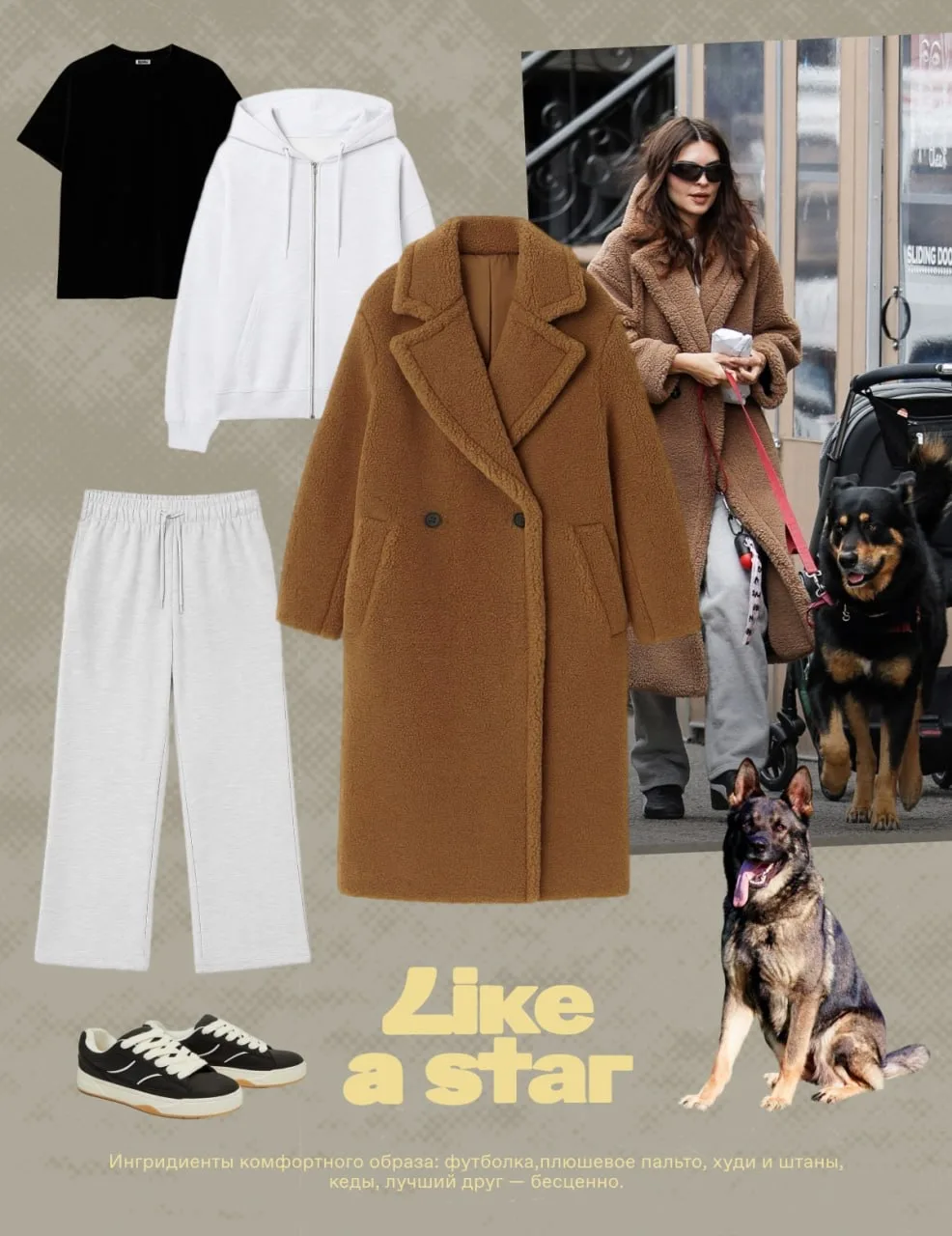 Эмили Ратаковски выбирает плюшевое пальто, кеды и расслабленный крой — комфорт, который притягивает взгляды.