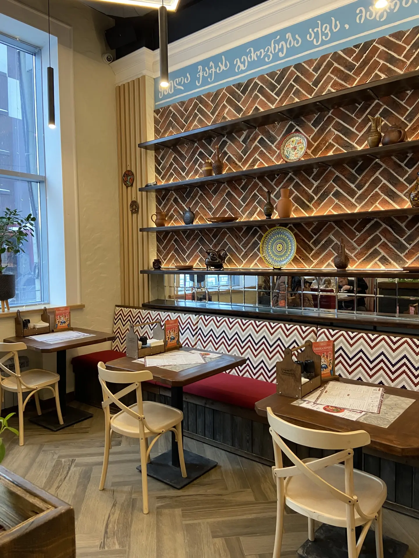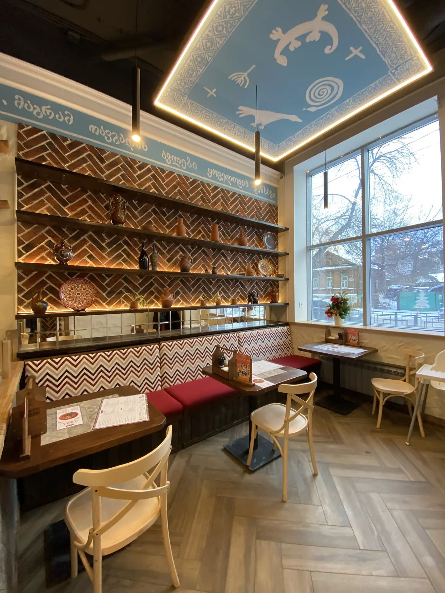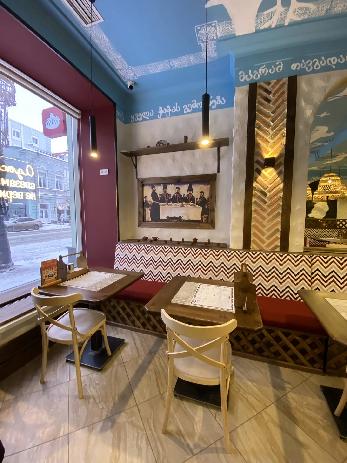 В меню русско-грузинского ресторана представлены домашние пельмени с мясом, укропом и говяжьим бульоном, а еще вареники с картофелем и белыми грибами.