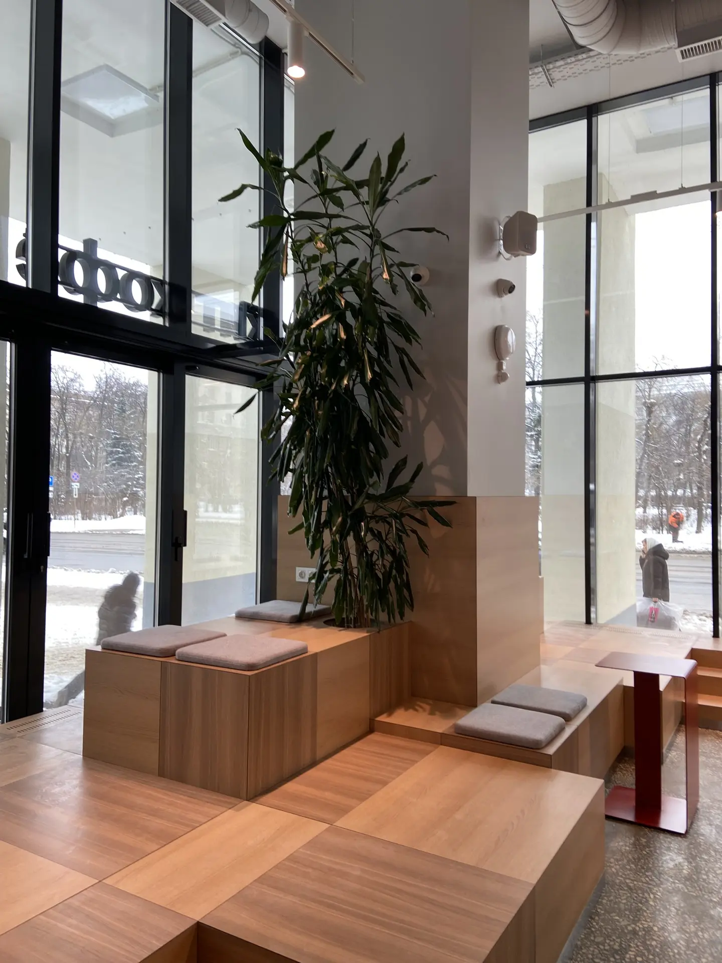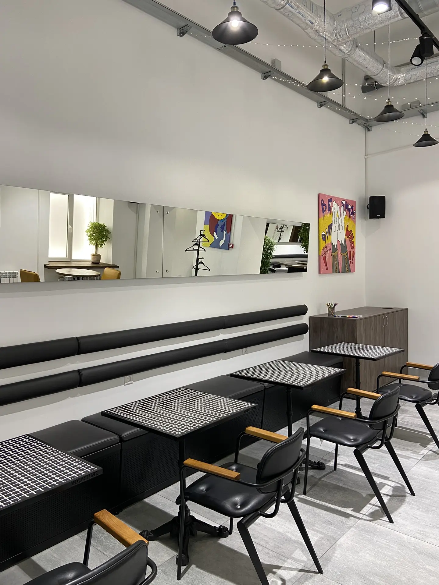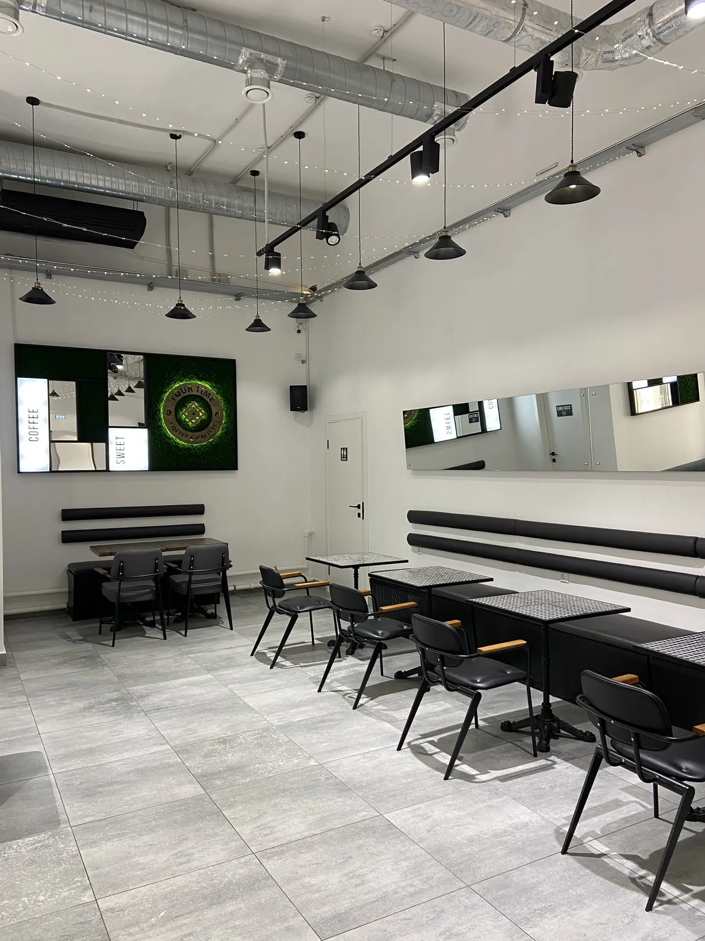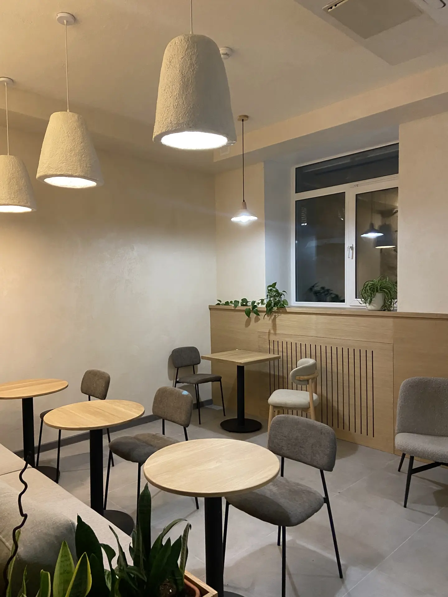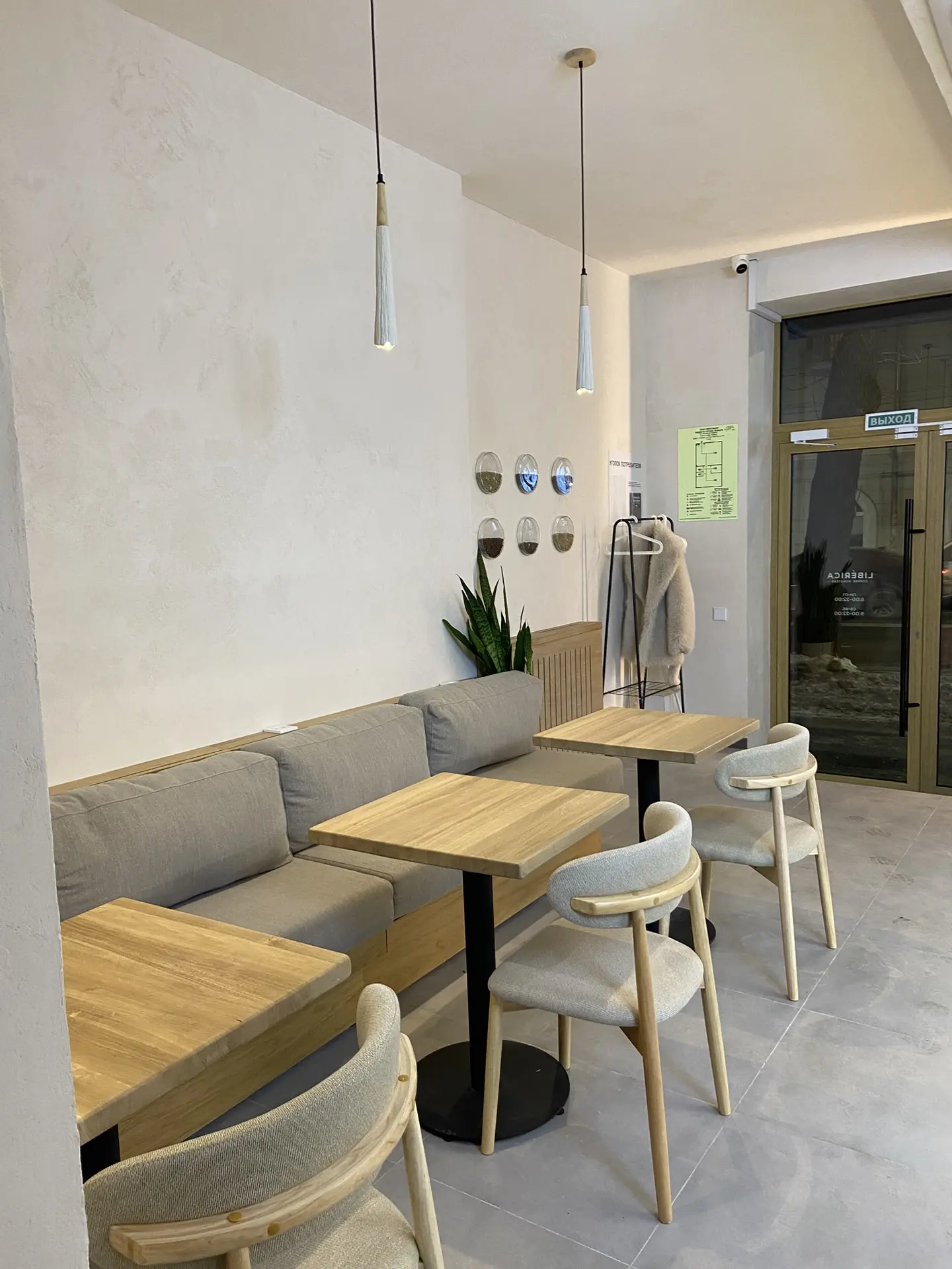 Внутри — светлое минималистичное пространство, есть где расположиться. Для маленьких гостей стоят детские стульчики.