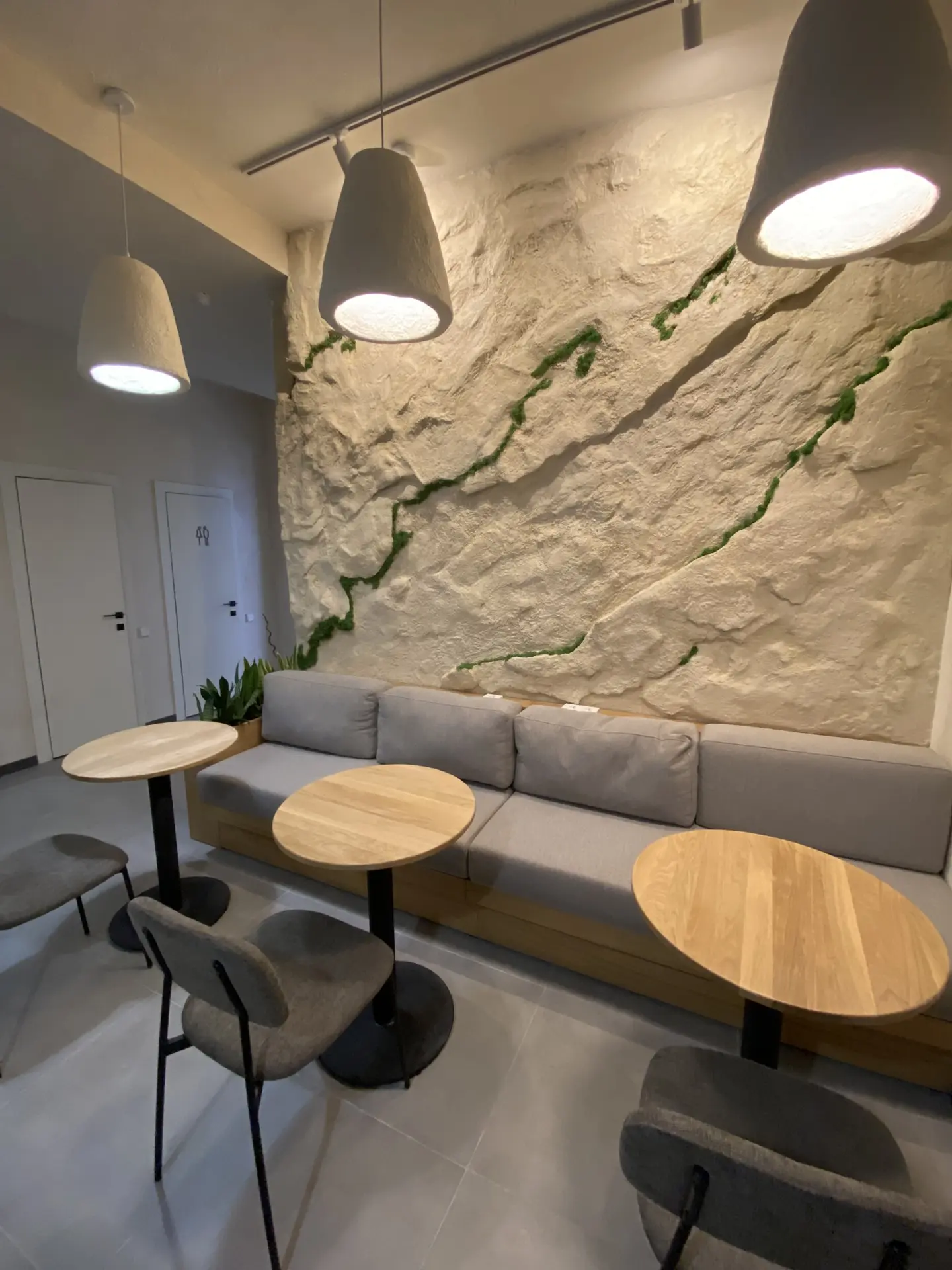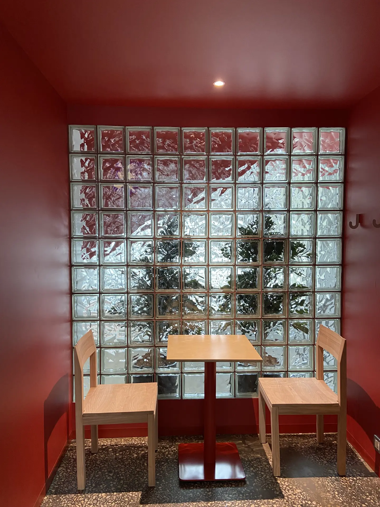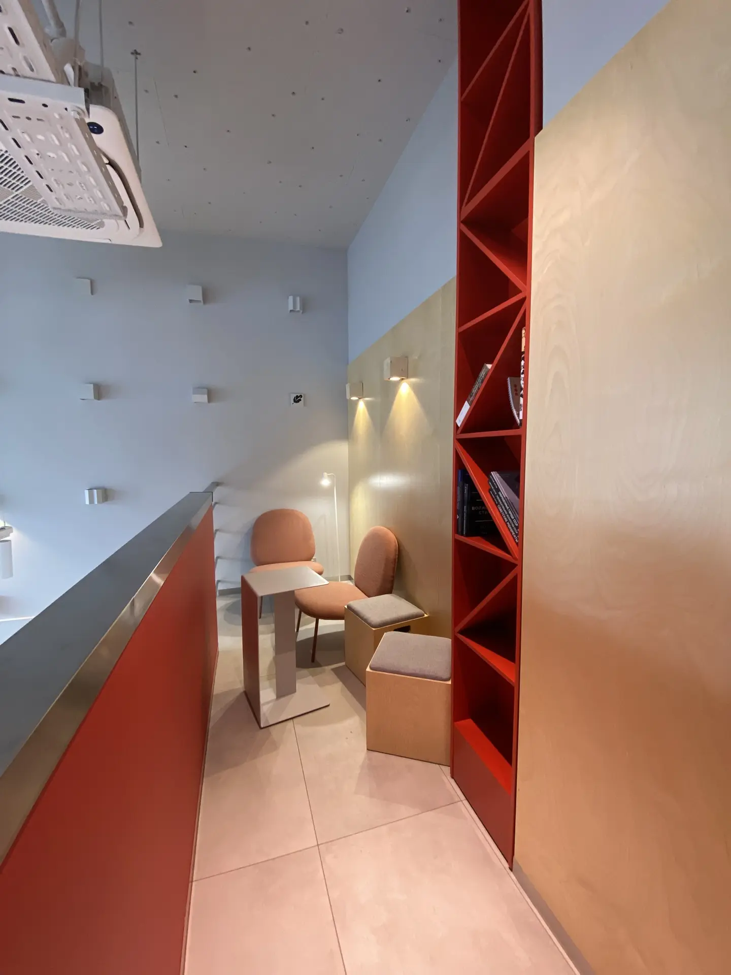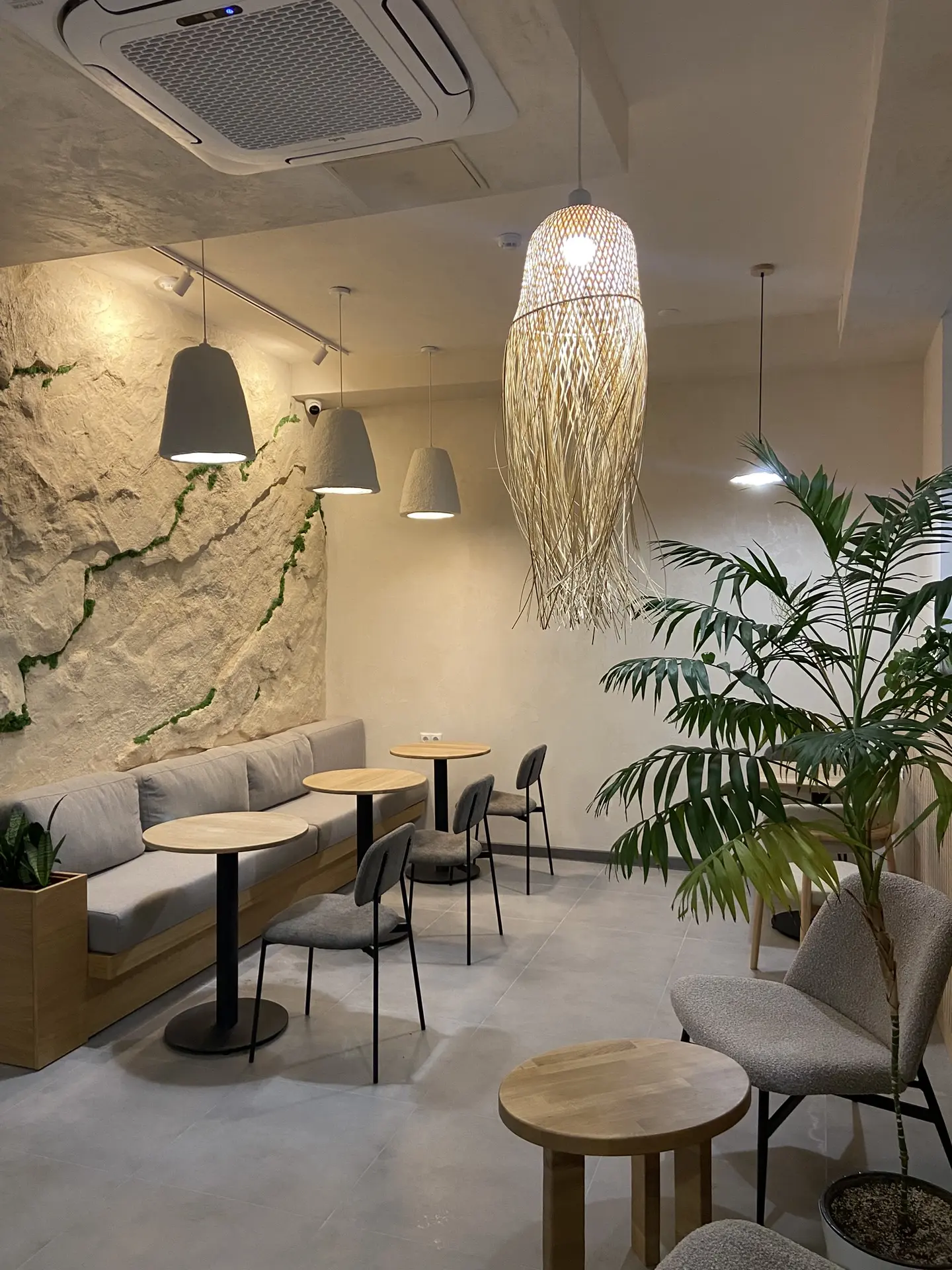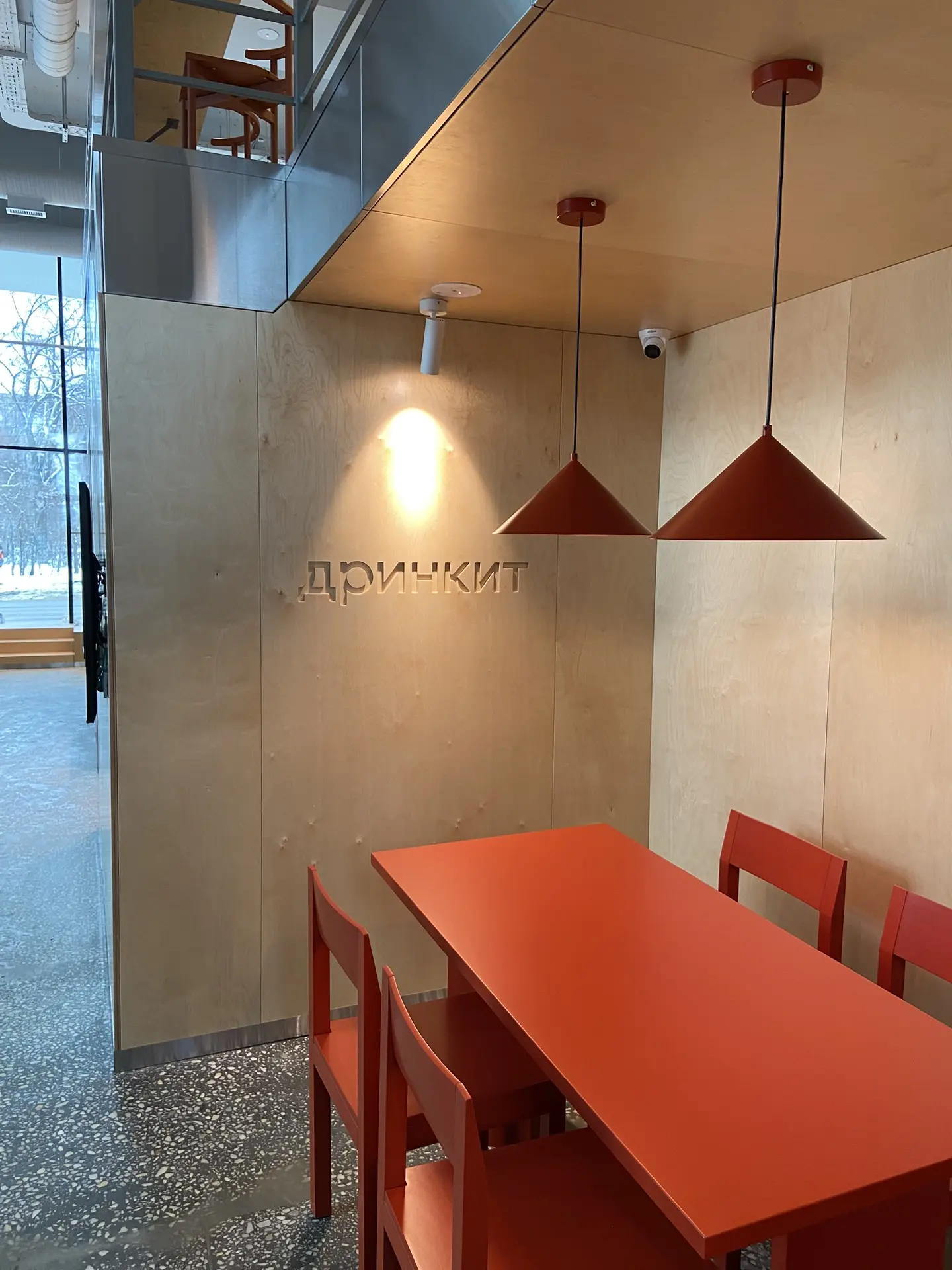 Внутри — светлое минималистичное пространство, есть где расположиться. Для маленьких гостей стоят детские стульчики.