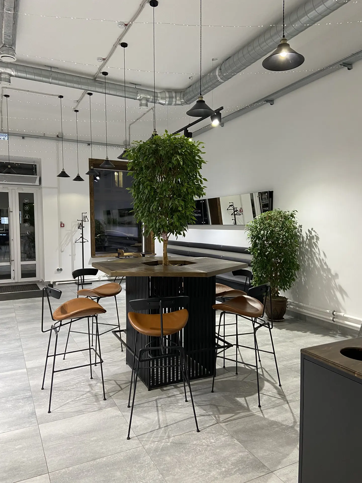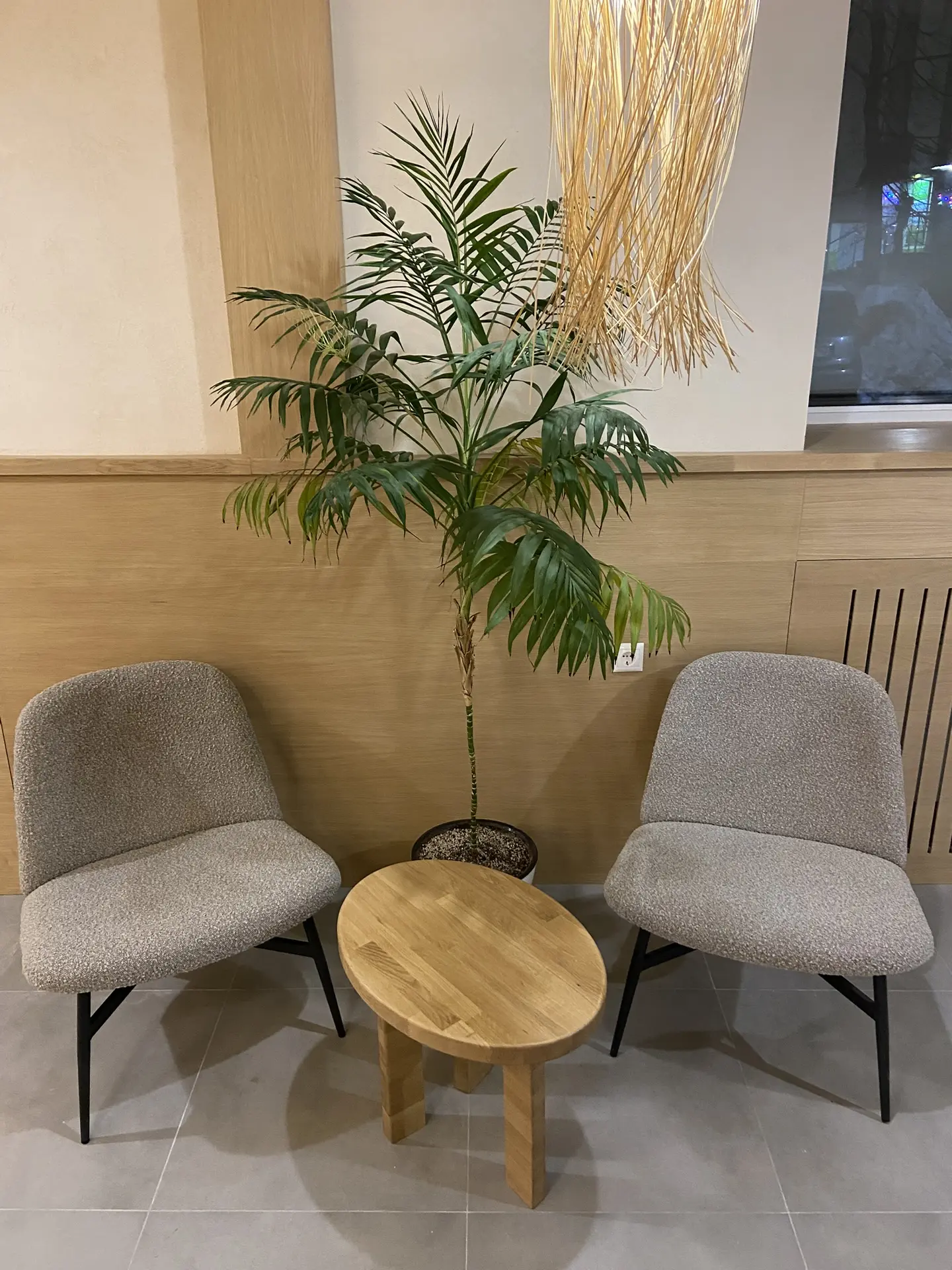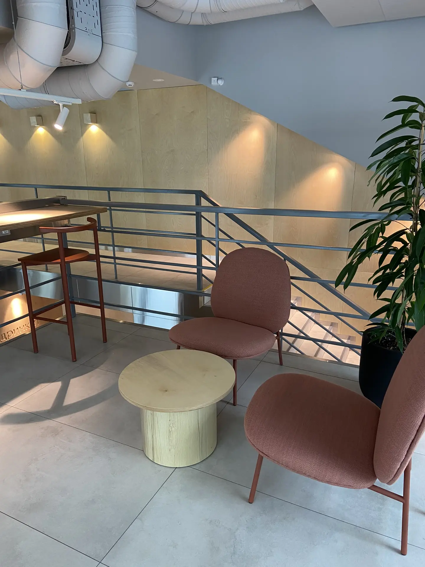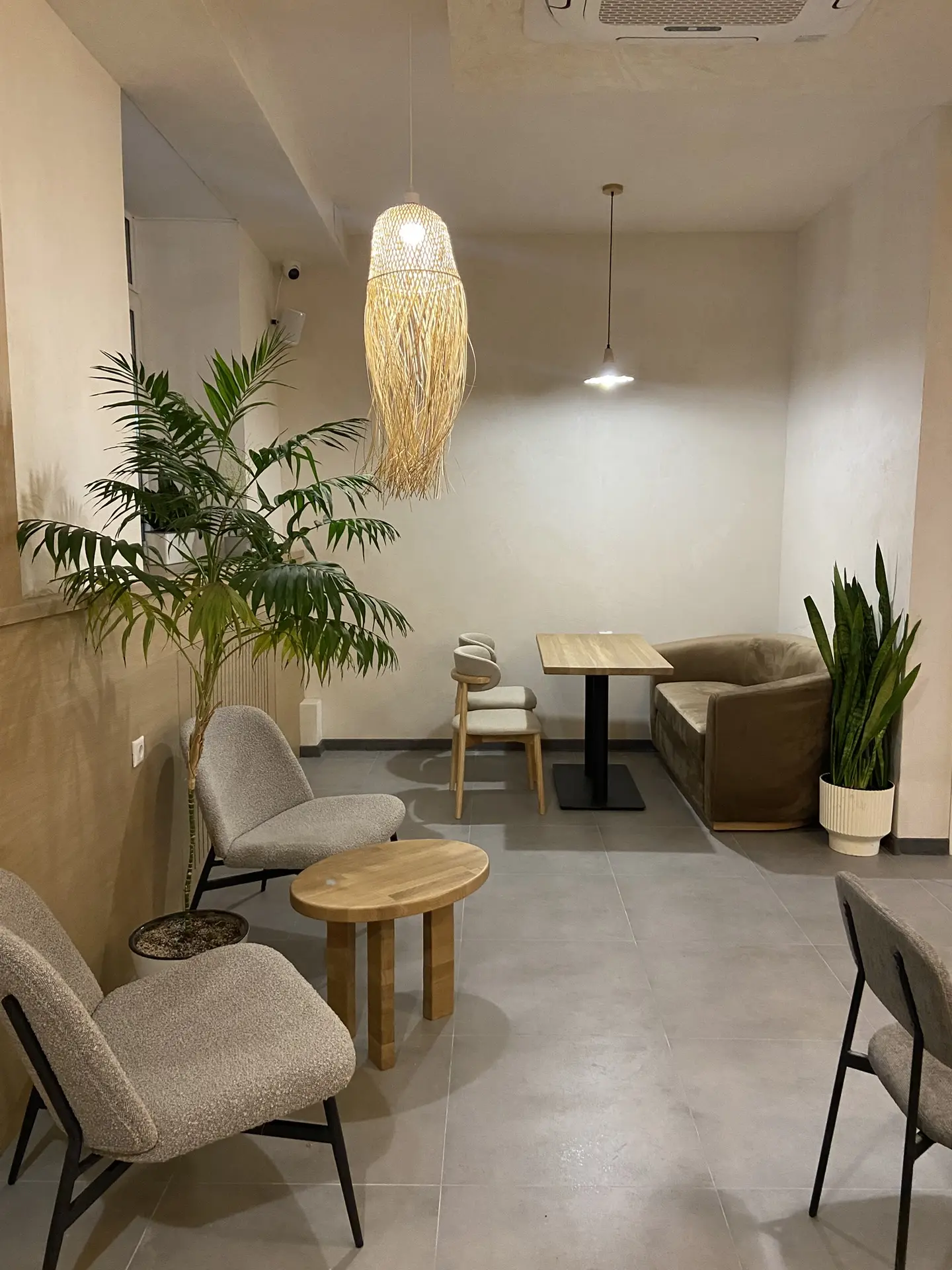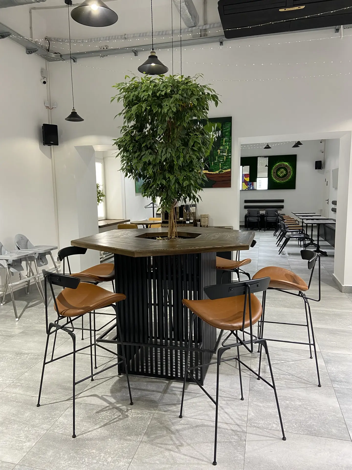 Внутри — светлое минималистичное пространство, есть где расположиться. Для маленьких гостей стоят детские стульчики.