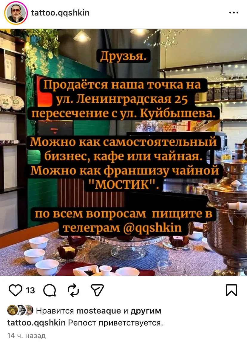 Недавно открывшуюся чайную «Мостик» на Ленинградской выставили на продажу