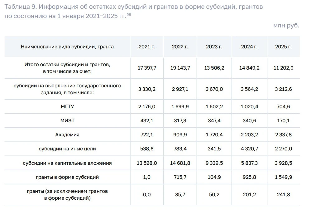 Неисполненные расходы вузов за счёт бюджета составили от 17 млрд рублей на 1 января 2021 года до 11 млрд рублей на 1 января 2025 года. Основная часть как раз пришла на субсидии на капстроительство.