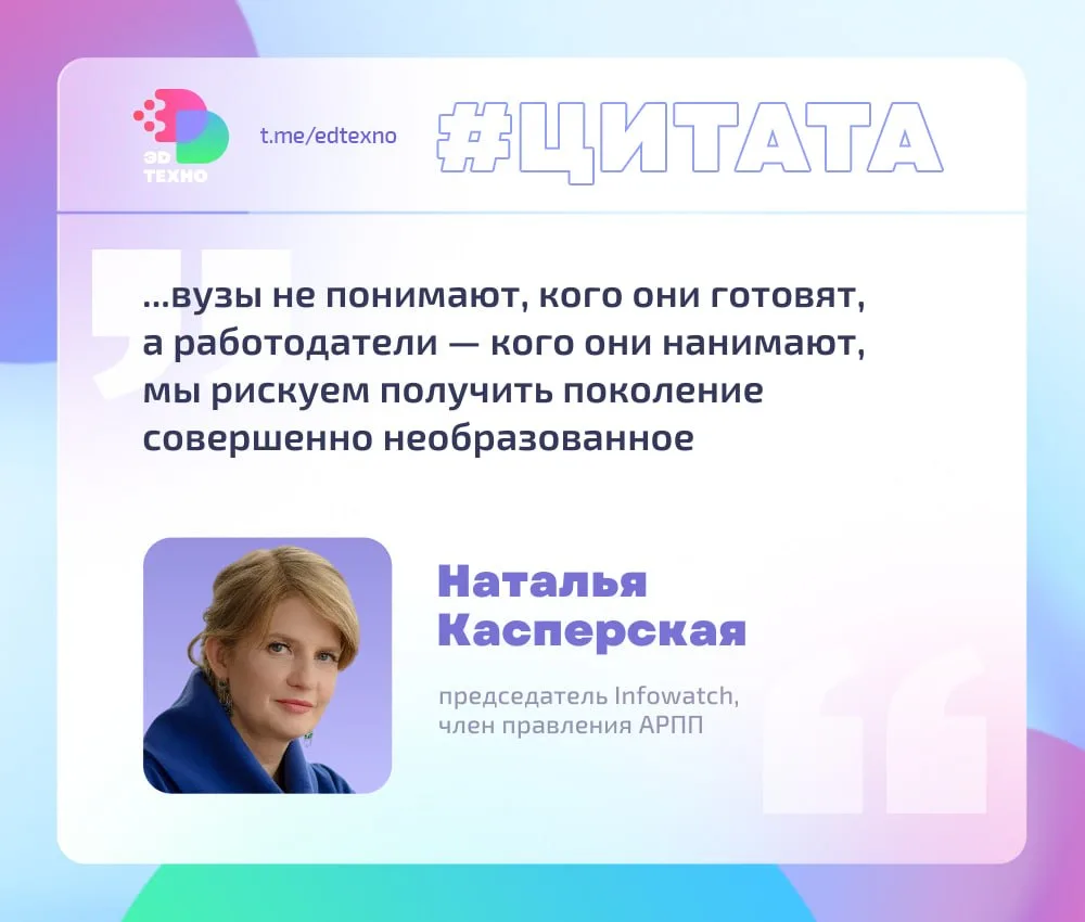 Чтобы сдвинуть дело с мертвой точки, Касперская предложила создать площадку совместно с представителями IT-отрасли, вузов, Минцифры и Минпромторга для обсуждения образовательных инициатив