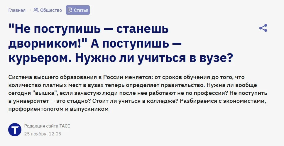 Очень странные дела творятся в ТАСС. Накануне, например, вышла статья с месседжем "Да лучше уж в дворники пойти, чем в гуманитарные вузы поступать".