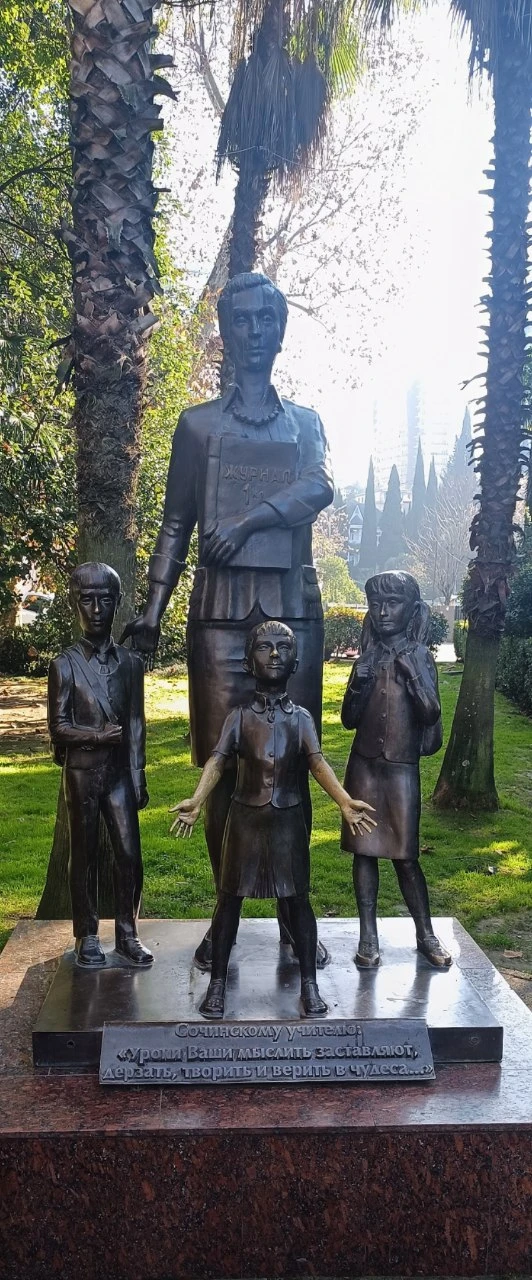 В сквере у администрации города Сочи стоит памятник молодой учительнице и её ученикам с такой подписью: