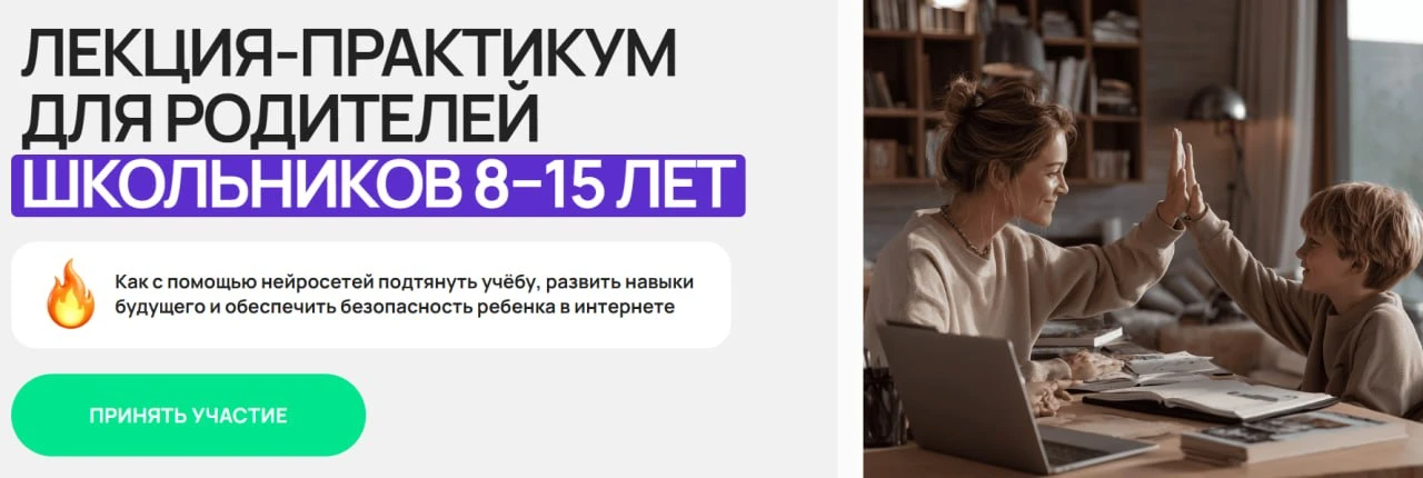 Стрельнувший на теме нейронок Zerocoder нащупал новую нишу — родители школьников. Увидели объявление о грядущем вебинаре на тему ИИ-инструментов для учёбы детей.