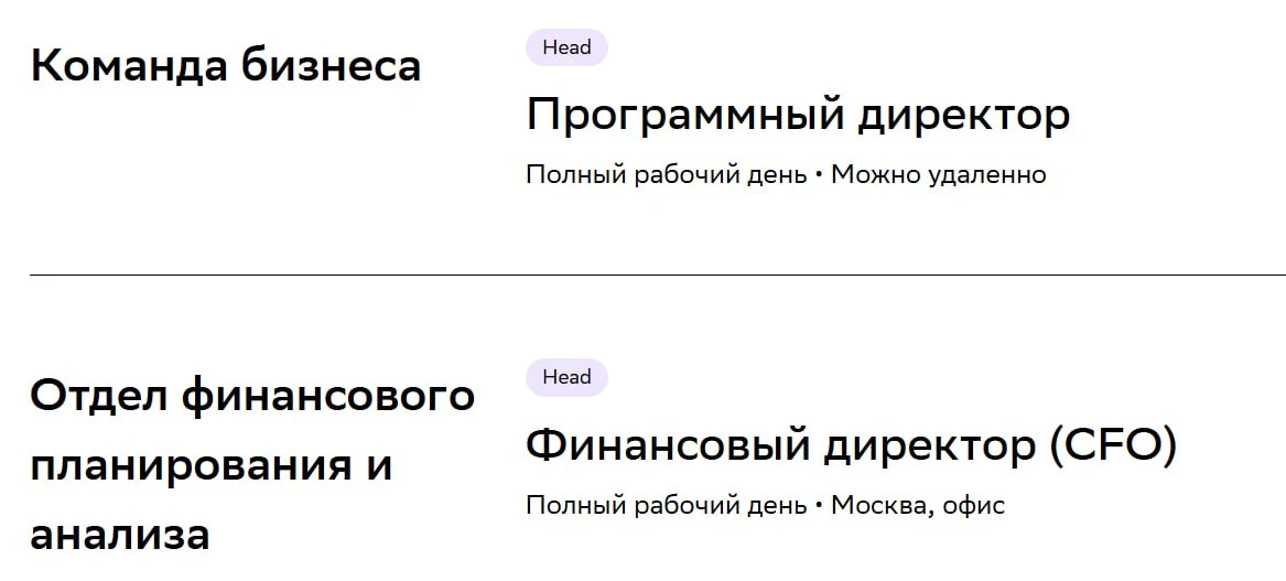 ▪️Вторая — финансовый директор, тут требования стандартные для этой позиции. Опыт от пяти лет, тоже зарплату не указывают.
