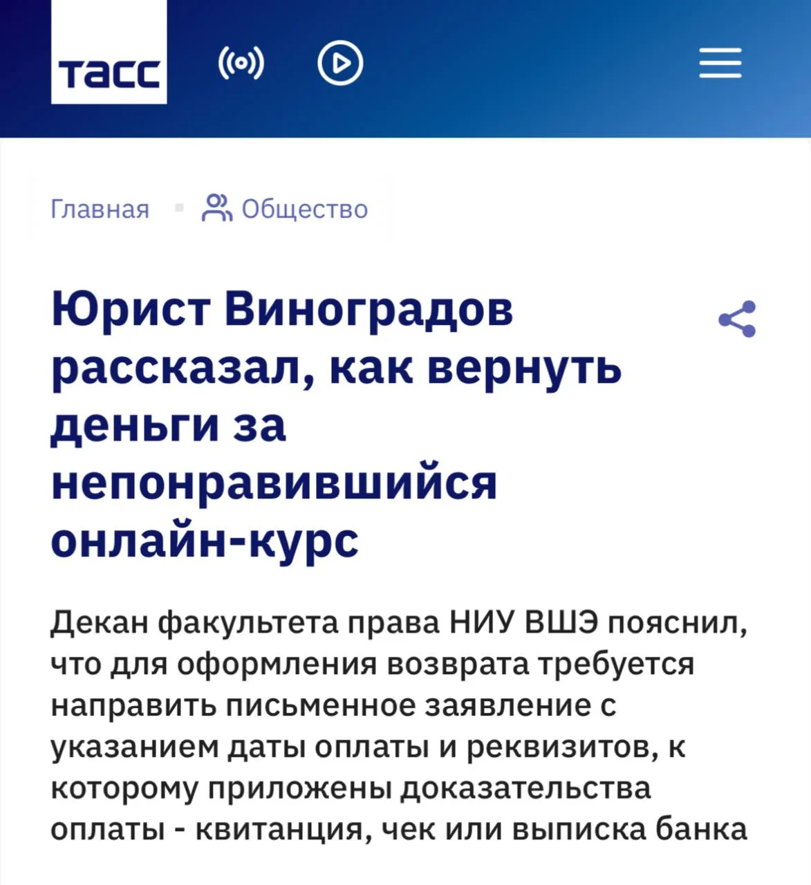 О возвратах денег за онлайн-курсы говорит не абы какой эксперт, а декан факультета права НИУ ВШЭ Вадим Виноградов.