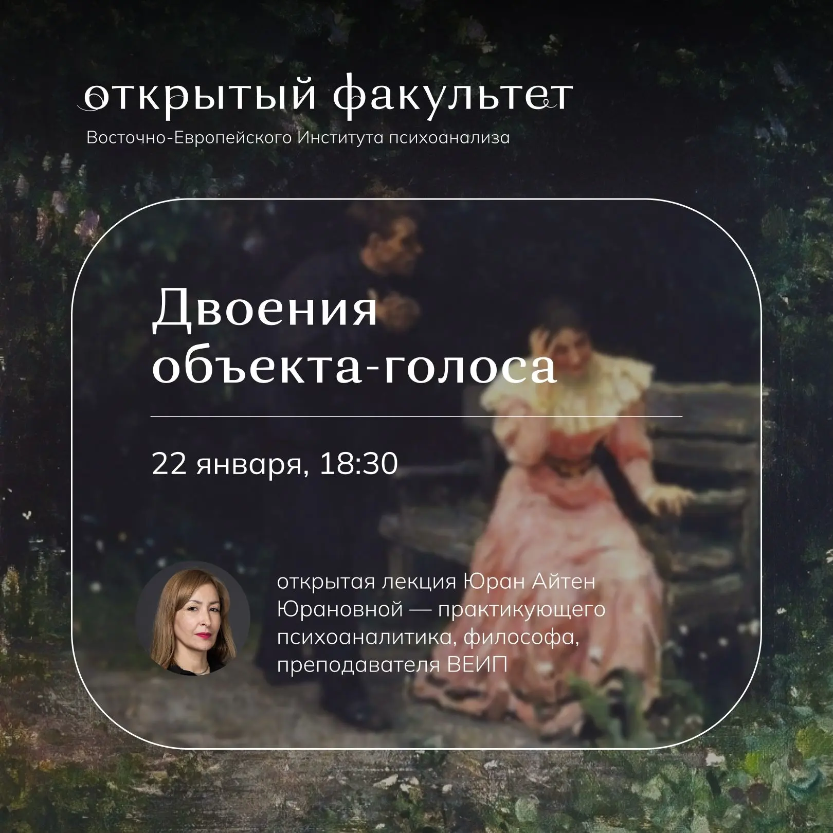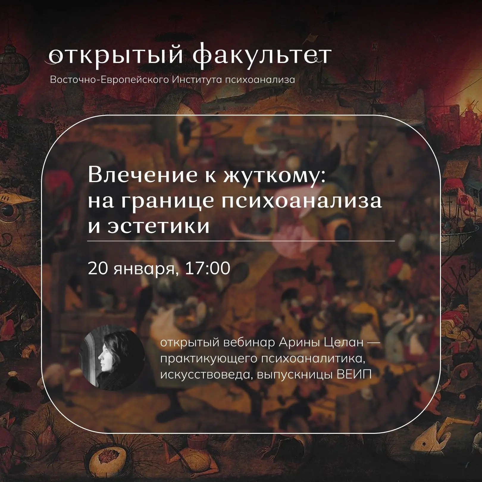 Открытый психоаналитический факультет приглашает на вебинар «Влечение к жуткому: на границе психоанализа и эстетики», который состоится во вторник, 20 января, в 17:00 МСК.