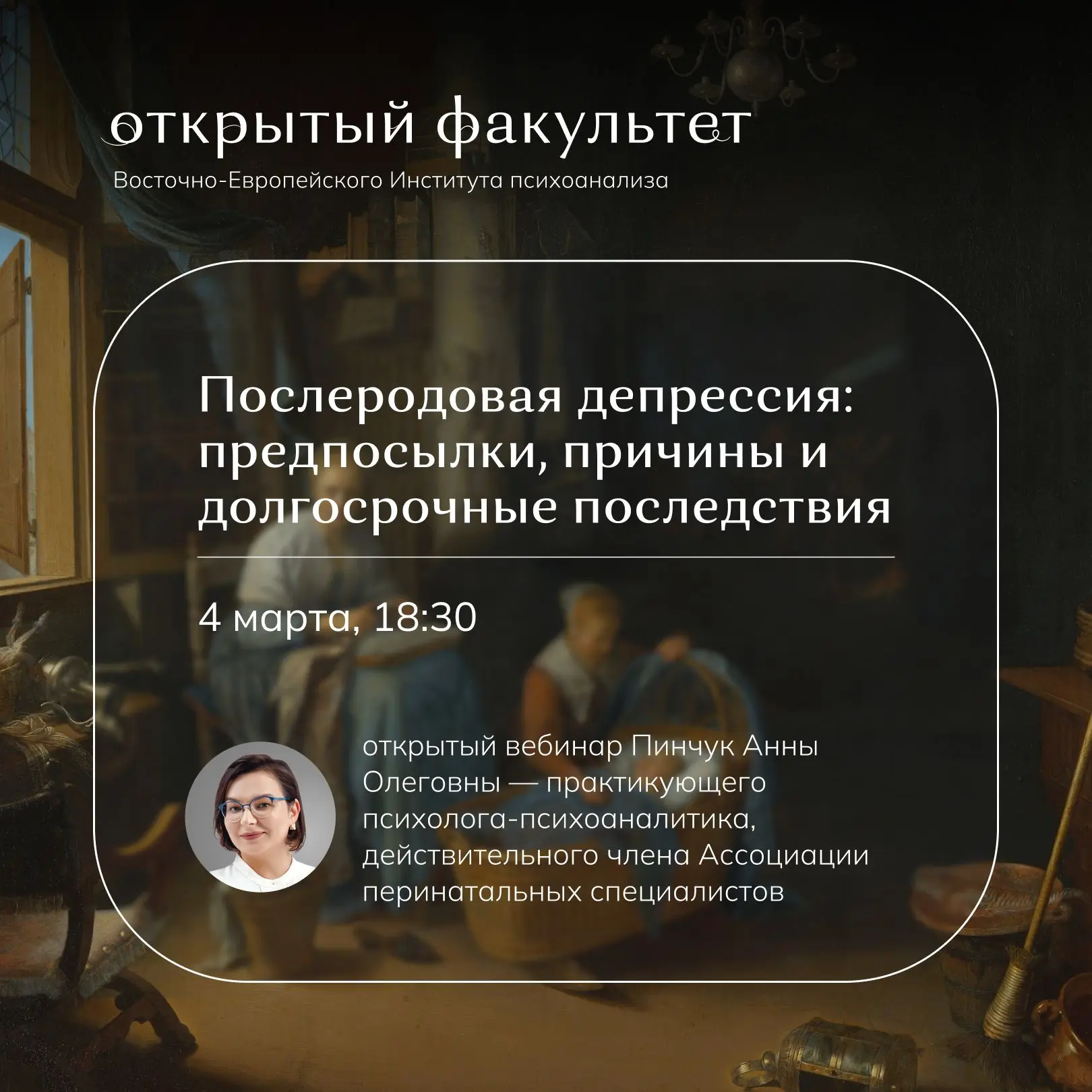 4 марта в 18:30 на открытом вебинаре «Послеродовая депрессия (ПРД): предпосылки, причины и долгосрочные последствия» вместе с психологом-психоаналитиком Анной Олеговной Пинчук мы разберём биологические, психологические и социальные предпосылки ПРД, факторы риска и механизмы её формирования, а также причины, по которым симптомы часто остаются незамеченными или нормализуются как «естественная усталость материнства».