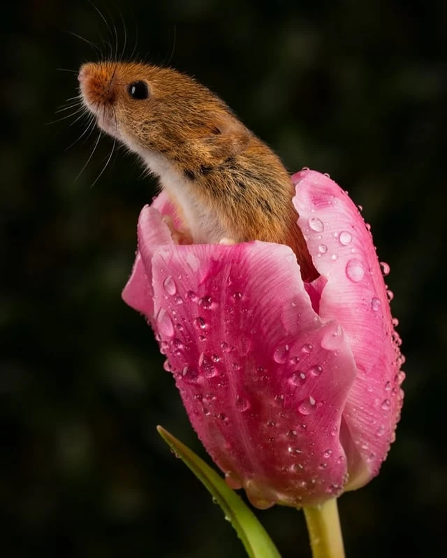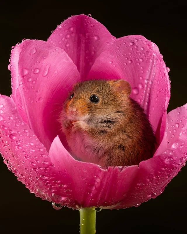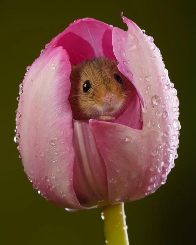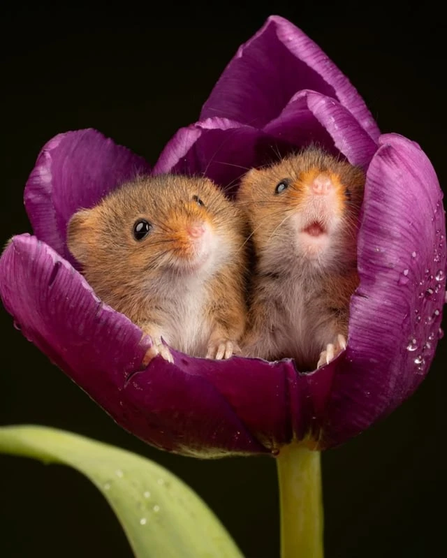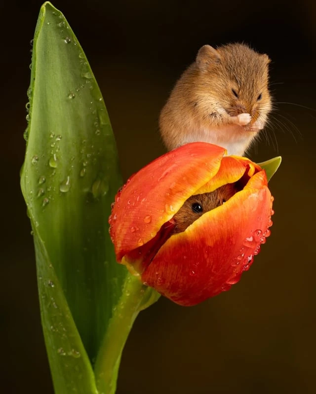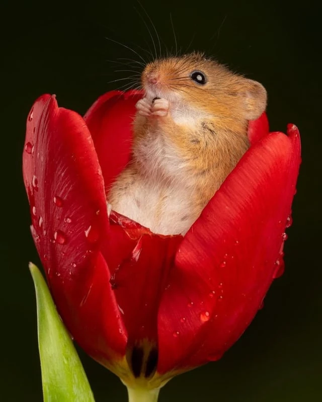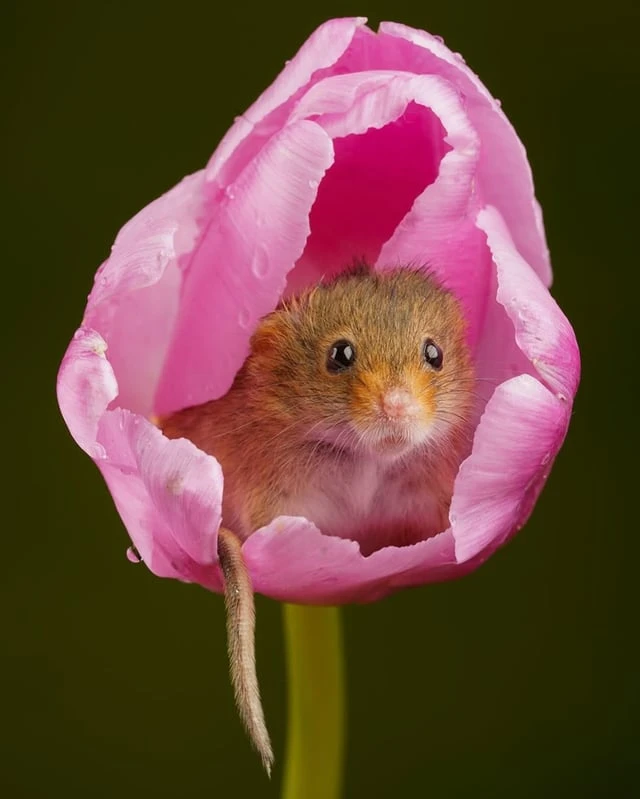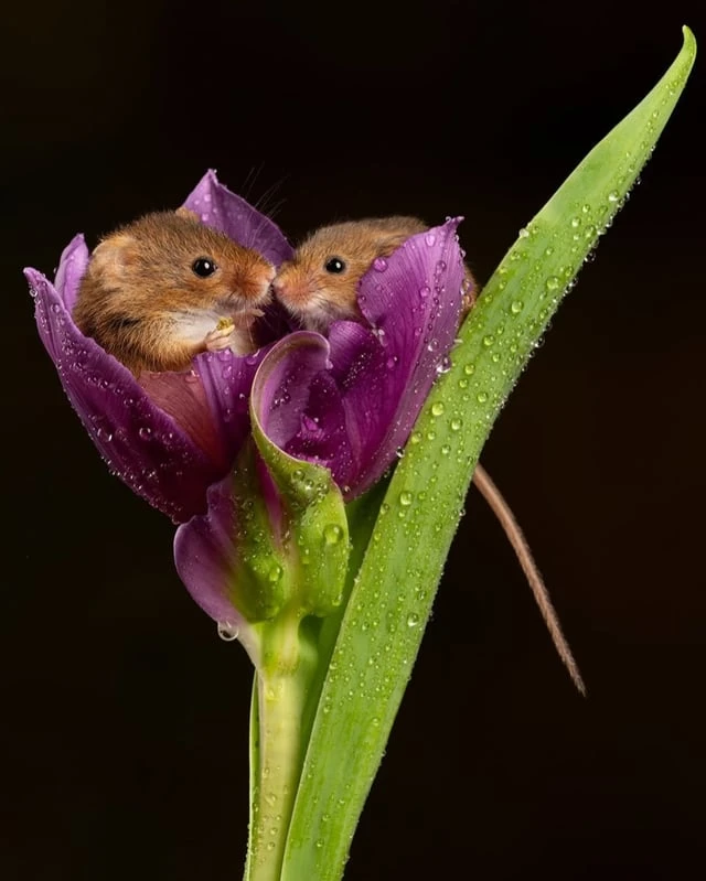Евразийская полевая мышь (Micromys minutus) — самый маленький грызун в Европе, весящий всего от 4 до 11 граммов и имеющий длину от 55 до 75 мм. Эти крошечные млекопитающие забираются внутрь цветов, таких как тюльпаны, чтобы питаться богатой питательными веществами пыльцой и нектаром. После пиршества они часто засыпают внутри лепестков.❤️🤩