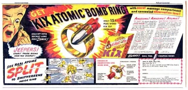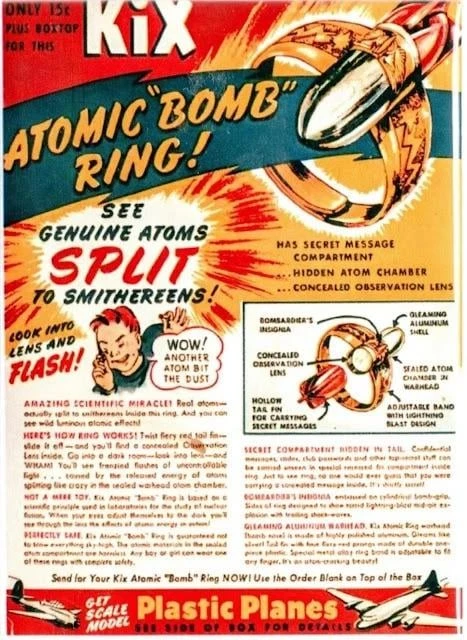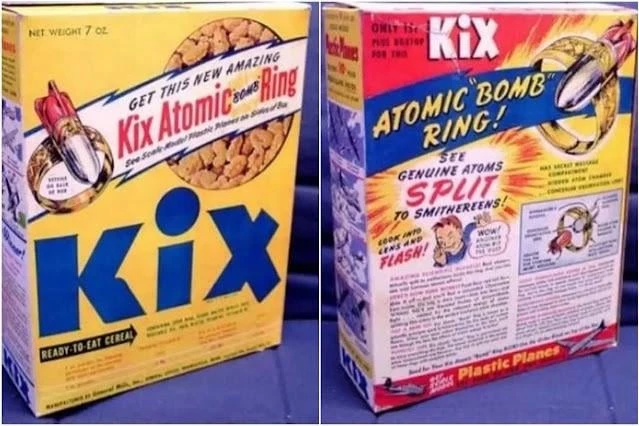 В 1947 году компания Kix Cereal выпустила кольцо в виде атомной бомбы в качестве игрушки, которая входила в коробку с хлопьями. Каждое кольцо содержало крошечное количество полония-210, одного из самых токсичных известных веществ, что делало кольцо тревожным примером легкомысленного отношения к радиации в ту эпоху.