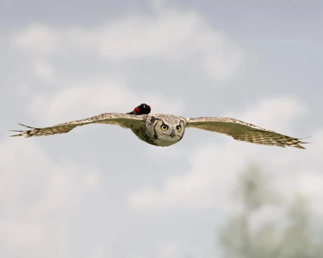 Краснокрылый чёрный дрозд верхом на большой рогатой сове.
