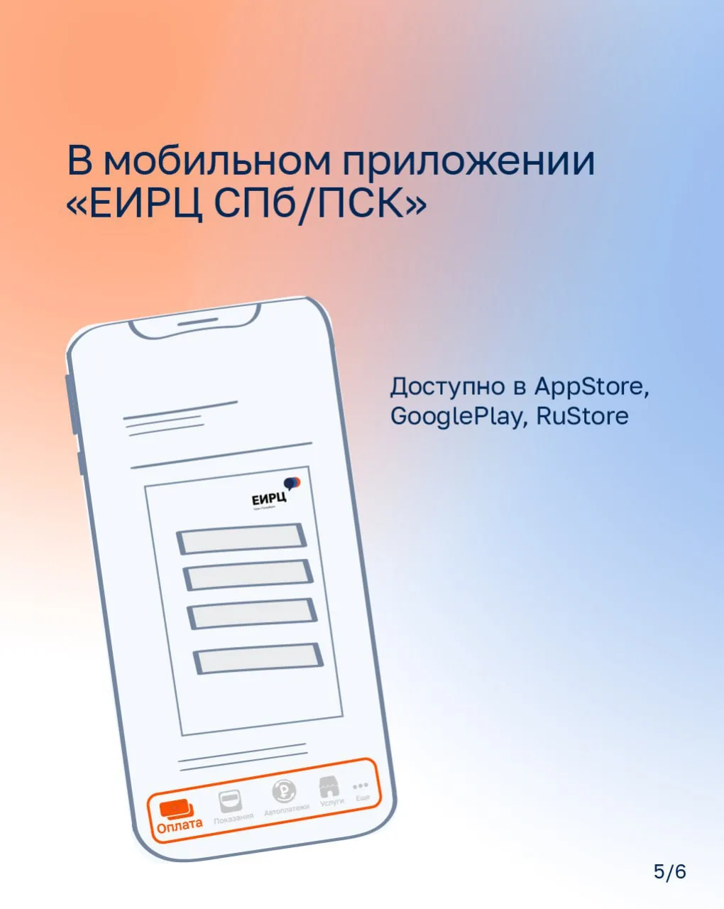 ✅️В мобильном приложении «ЕИРЦ СПб/ПСК», в разделе «Оплата». Приложение доступно в AppStore, GooglePlay и RuStore.