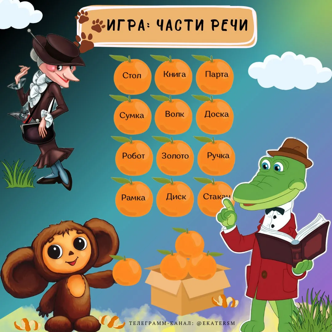 🌟Вспоминаем признаки частей речи и дарим мандарины героям.